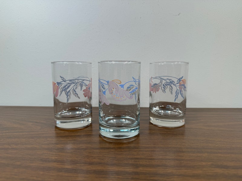 Three Crisa Floral Band 6 oz Juices Glasses - 1980s 80s Pastel Pink, Mauve, Green Flowers Botanical Spray Retro Small Glasses Set of 3-sid-80566