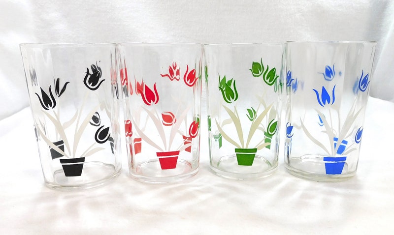 Vintage 1930s Depression Set 4 Swanky Swig Juice Glasses Tulip Pattern Black Blue Red Green 3.5" Tall EUC Kitchen Decor-sid-34047