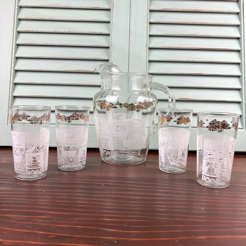 Vintage 1960’s Colonial Days Anchor Hocking glass pitcher and four glasses. 2 quart pitcher and four 8 ounce glasses. Gold and white design.-sid-59382