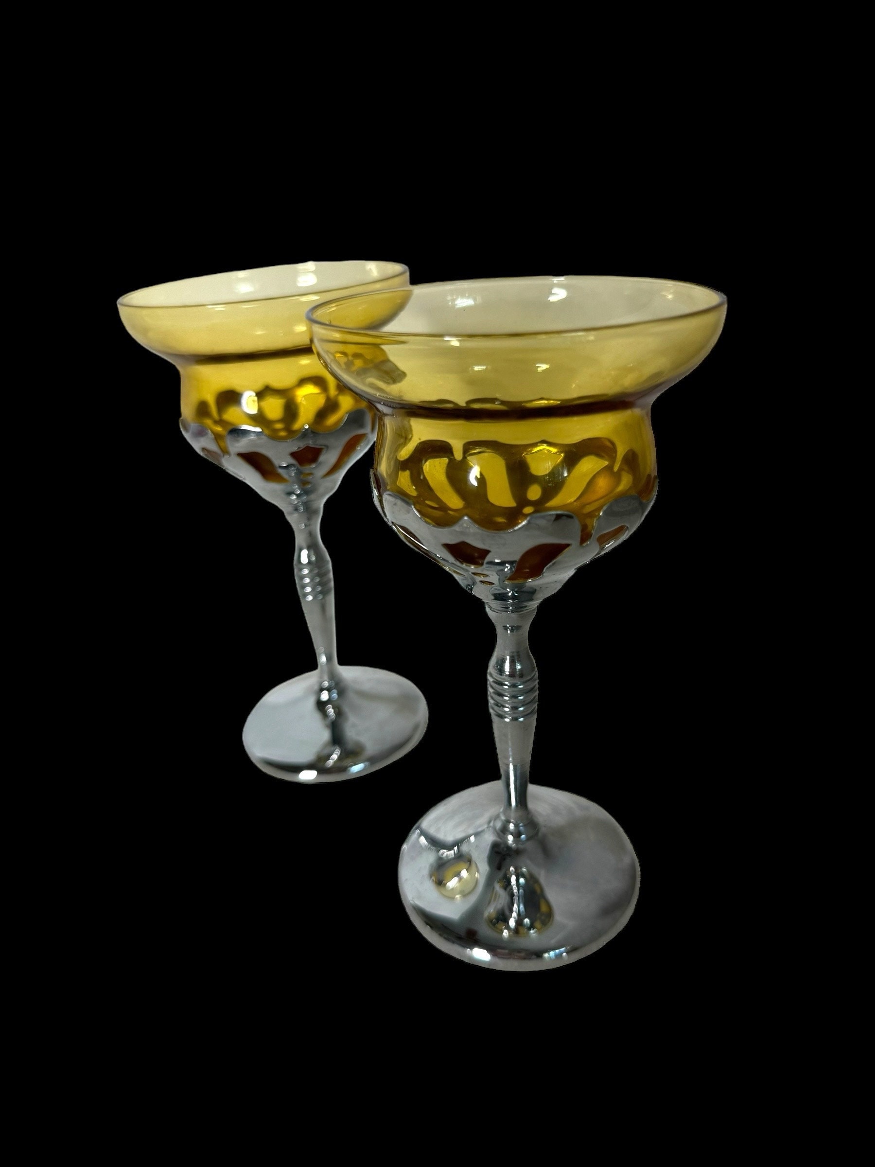Vintage 1960s Farber Brothers Krome Kraft Amber/golden yellow and Silver cordial cordial glasses barware/set of 2/cambridge glass
