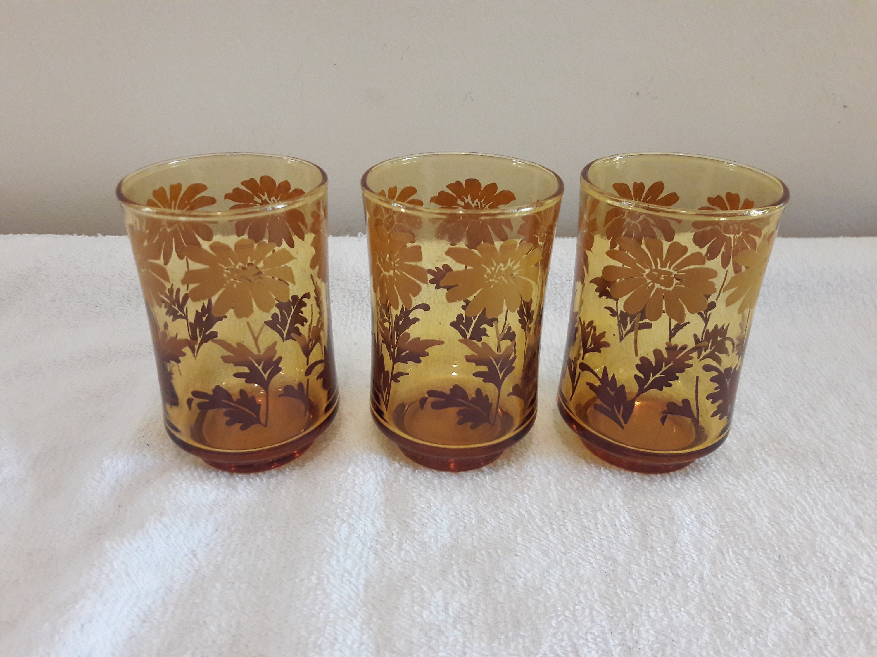 Vintage 1970's Libbey Daisy Amber Floral Juice Glasses