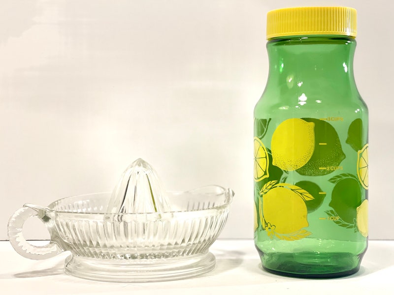 Vintage 1970s Juice Set Features Ribbed Clear Glass Citrus Reamer + Anchor Hocking Green Glass Lemon Carafe w/ Lid and Cup Measurements-sid-76436