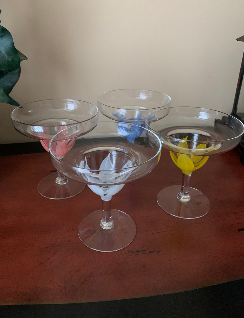 Vintage Hand Painted Margarita Glasses with Floral Design 5" Tall, Dessert Glasses, Mid-Century Modern, Retro Barware, Boho, Set of Four (4)-sid-67008