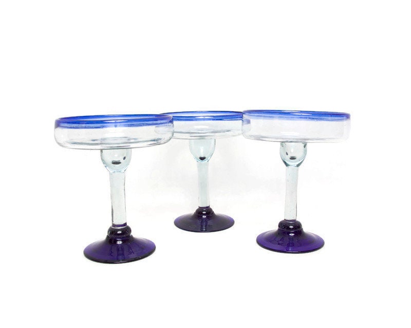 Vintage Margarita Glassware Hand Blown Mexican Glass Cobalt Blue Clear Wide Rims Cocktail Goblets-sid-81967