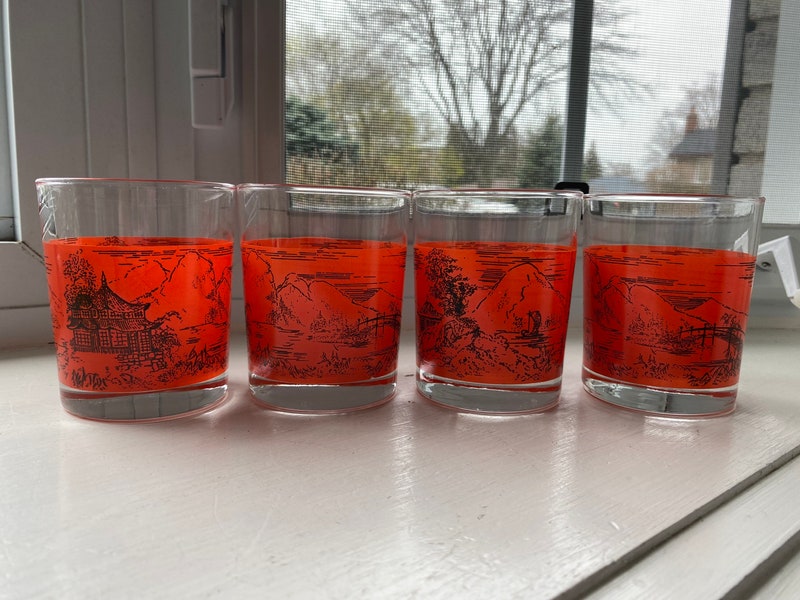 Vintage Set of 4 Bar Glasses In Bright Orange/Red With Pagoda and Mountains Scene, Retro Barware, Scotch Glasses-sid-46136