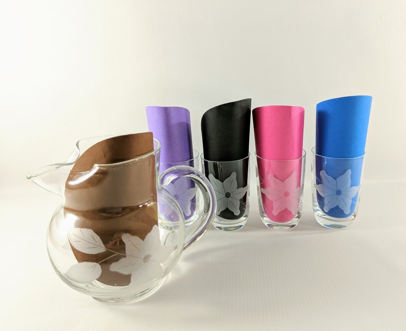 Vtg. 5 Pc. Blown Glass Juice Set with Etched Flowers. Pitcher with 4 Matching Glasses. Mid Century Kitchen. Breakfast/Brunch Dishes.-sid-24046