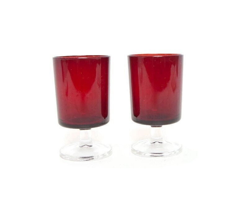 Vintage Ruby Red Footed Juice Glasses: FRANCE CAVALIER Luminarc Arcoroc Cordials, Retro Goblets Stemmed Barware-sid-79598