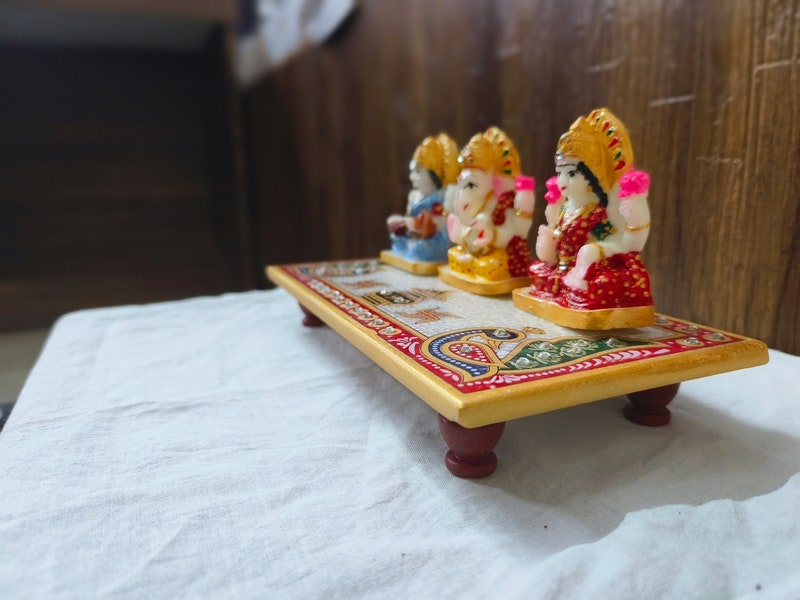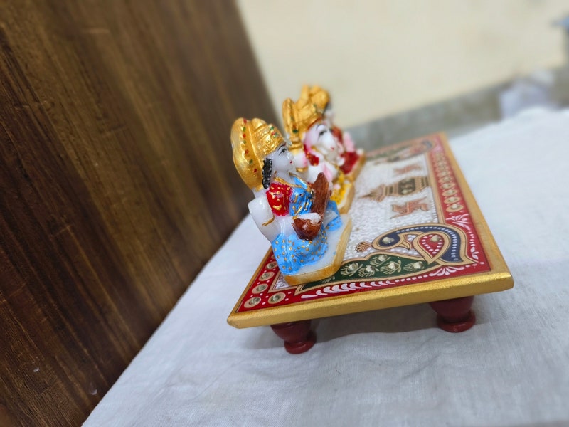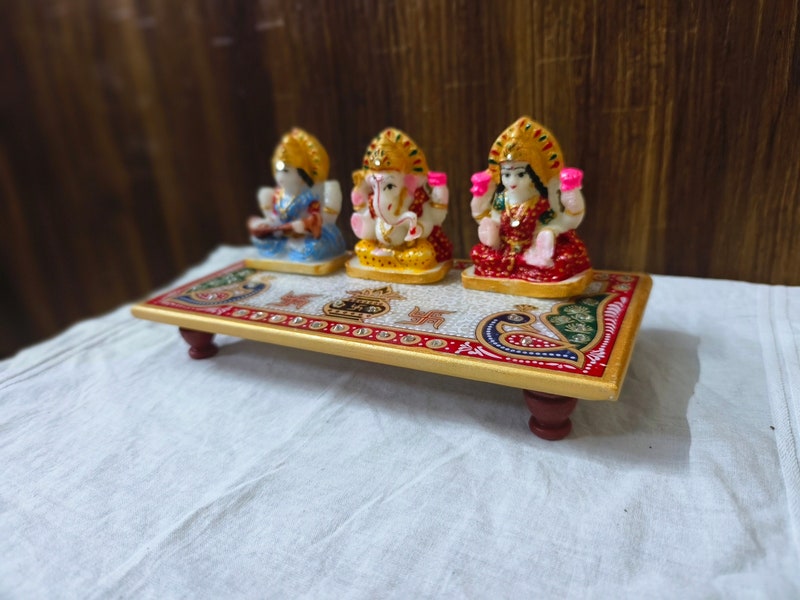 Indian Handmade Hand Paint Marble Pooja Chowki For Your Spiritual Journey For Fulfill Your Wishes .The vibrant colors and intricate detailing bring an aura of grace .Lord Ganesh is known as God of wisdom, success and prosperity and is widely revered as the remover of obstacles. As the god of beginnings, he is honored at the start of rituals and ceremonies. God Laxmi Is Known As God Of Wealth & Saraswati is Known As God Of Knowledge. A meaningful & Lovely Gift for your loved ones. Order now to experience the blend of tradition and modernity in this unique piece of art.