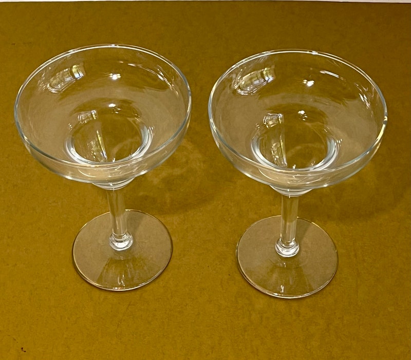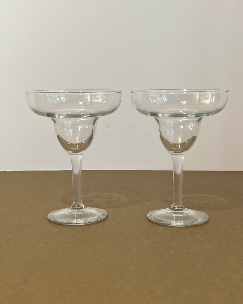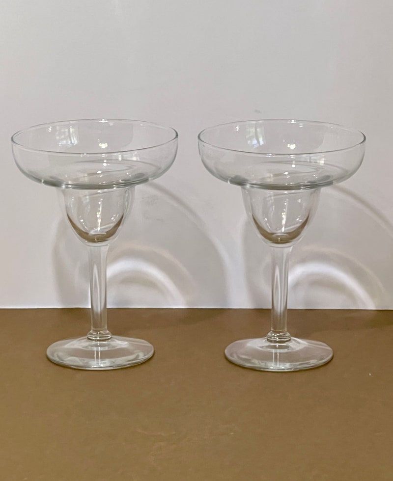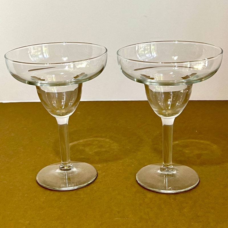 Beautiful set of two clear Margarita glasses. Each glass holds 16 fluid ounces and both are in excellent condition. Vintage, well made, no chips, no cracks. Add to your barware or give as a beautiful gift. Please review photos for a visual description.