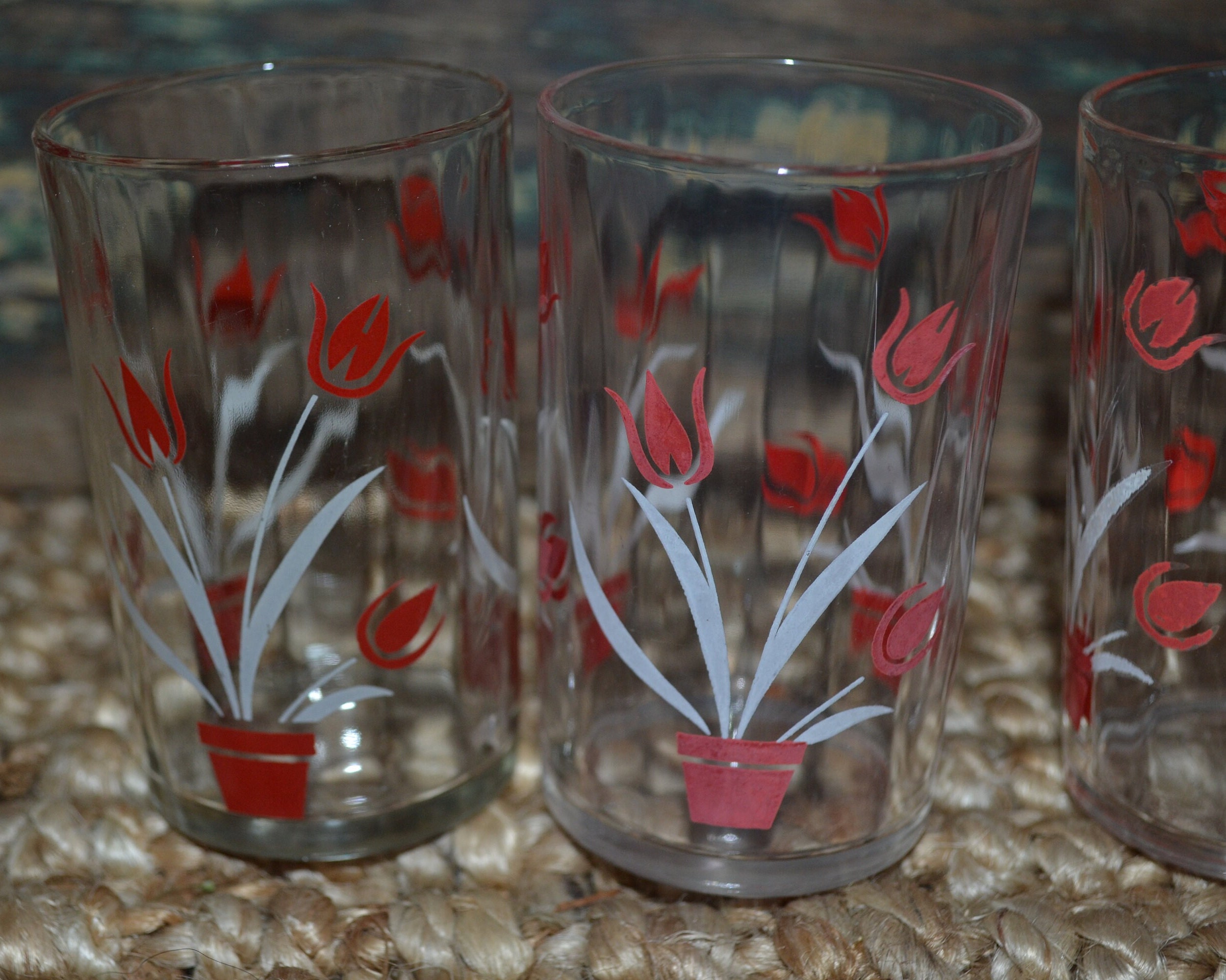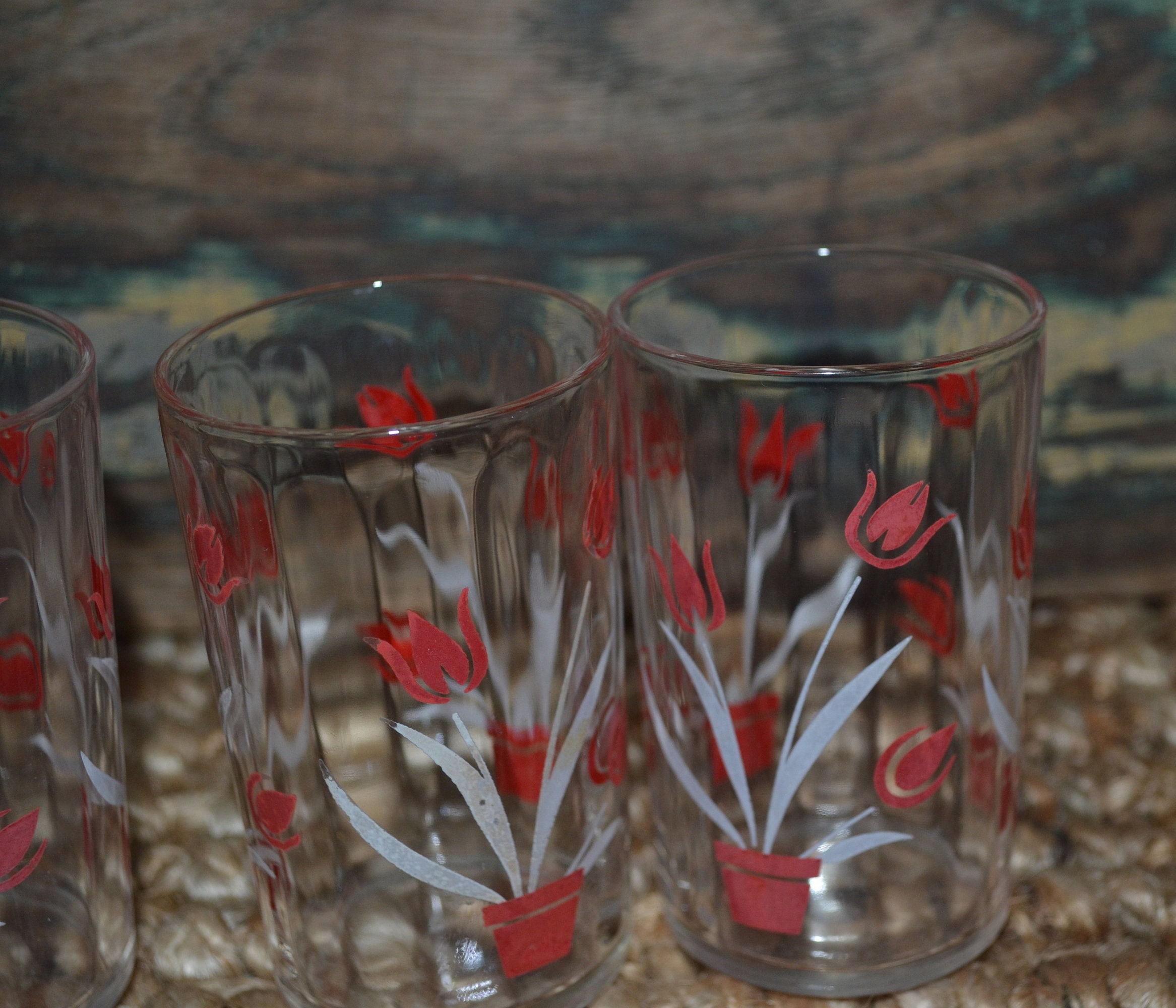 This set is the tulip pattern which has long white leaves with red tulips. This set has fading to three of the glasses. There are no chips or cracks, please the photos as they are part of the description.
