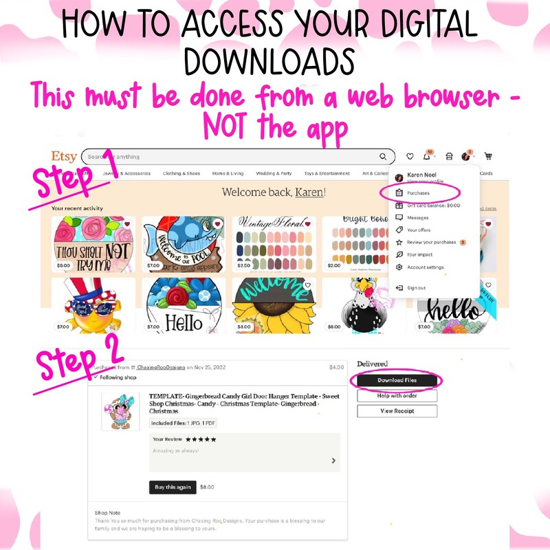 If you have an account: go to Your Account ("You" circle in the top right) -> "Purchases and Reviews" and look for the order. The button will say "download files" in a black box. (You may have to be using a laptop/computer to access the downloads...if you're on a phone you may not be able to see this button as Shoppy may not be allowing ).