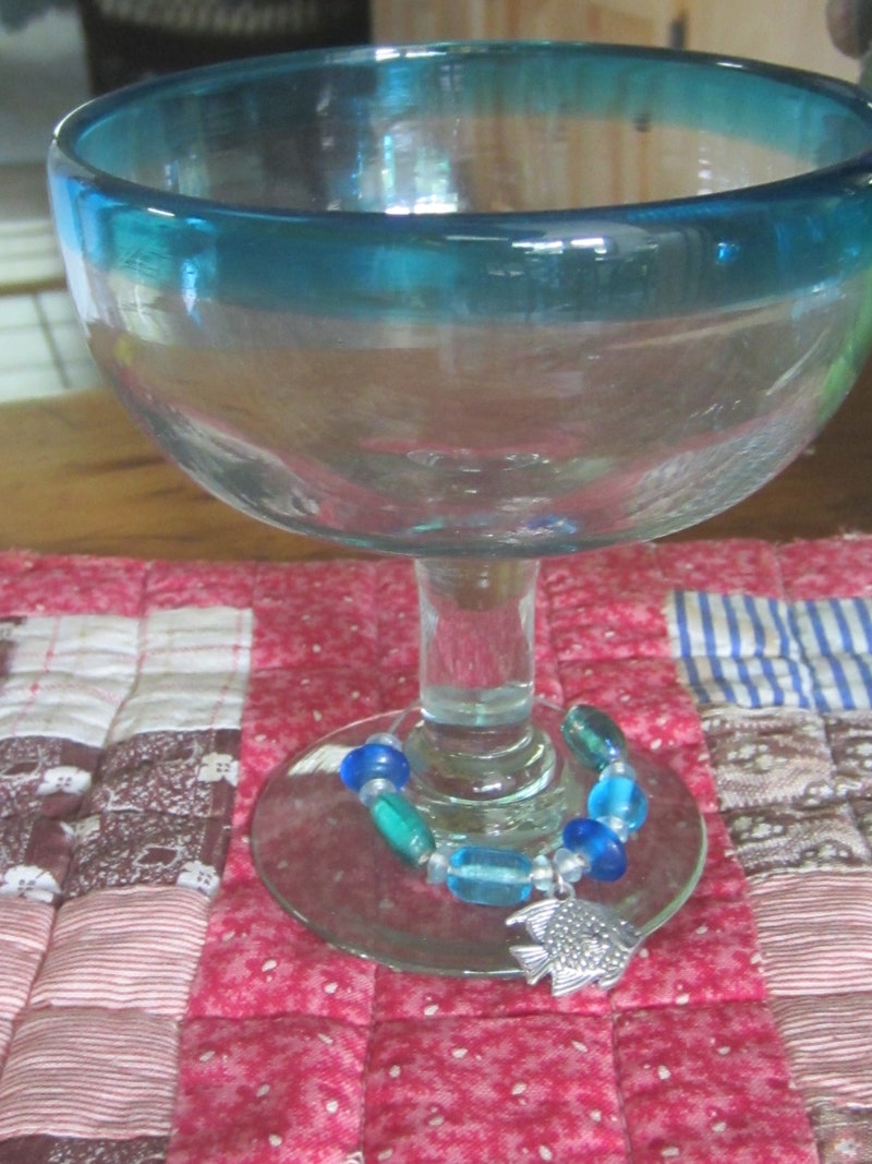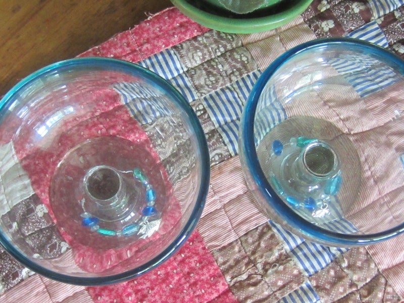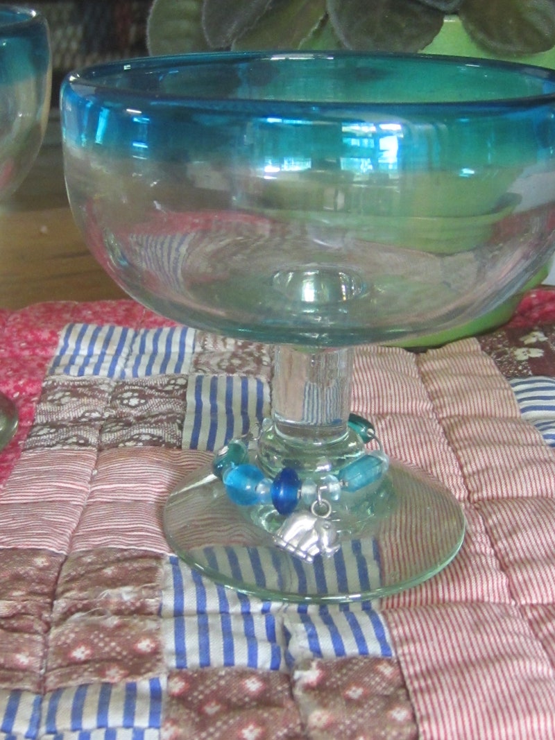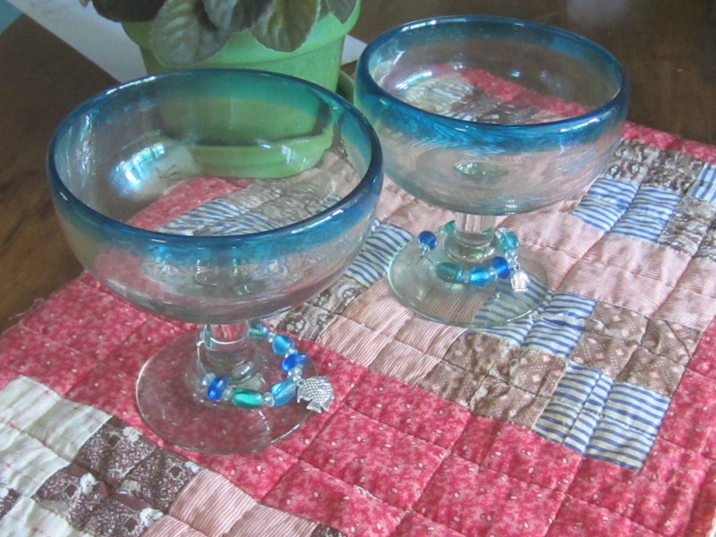 Don't these TWO beautiful Margarita glasses just remind you of sitting poolside in the sunset? They are now ready to find a new home. They are in mint vintage condition, have been very gently used, see photo. The trinkets are easily removable. From a clean, smokefree home.