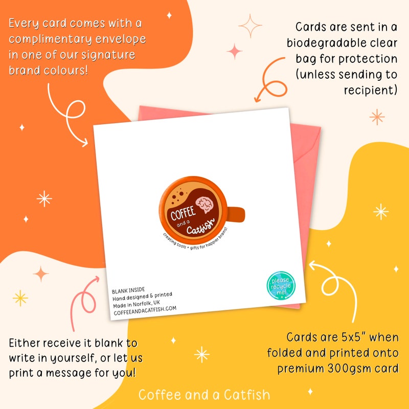 Please write your message in the gift note box on the purchase page. This will then be printed inside the card in our signature Coffee and a Catfish font (as seen in product photos). Alternatively, you can message me via the app or email , but please make sure you check it for spelling mistakes, as we cannot be held responsible for errors.