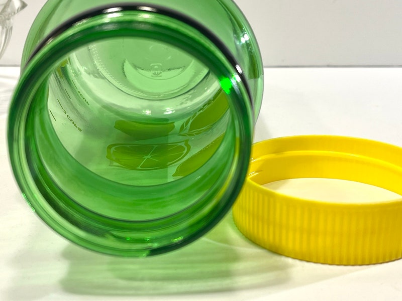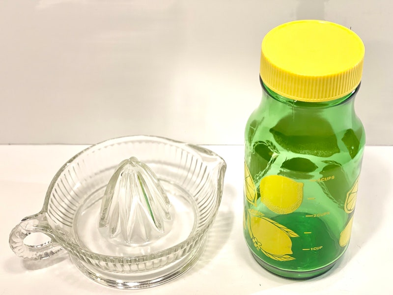 Vintage 1970s Juice Set Features Ribbed Clear Glass Citrus Reamer + Anchor Hocking Green Glass Lemon Carafe w/ Lid and Cup Measurements-sid-76436