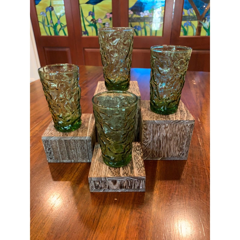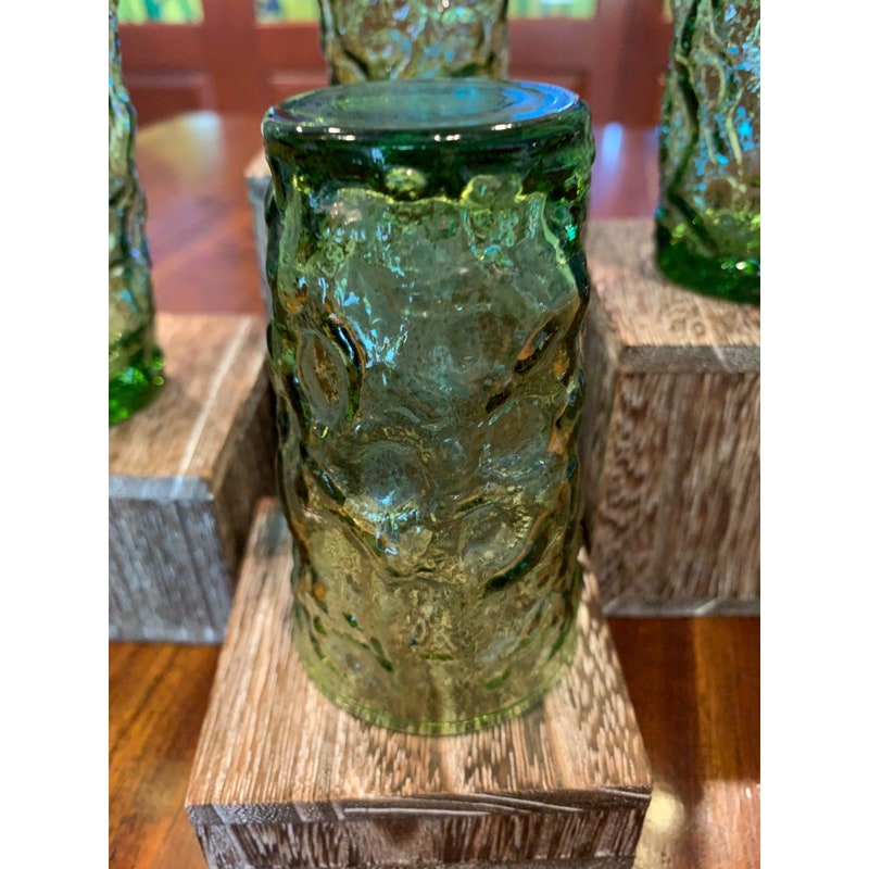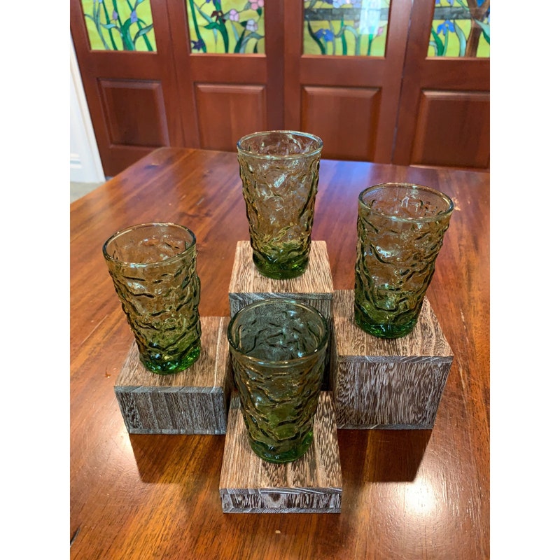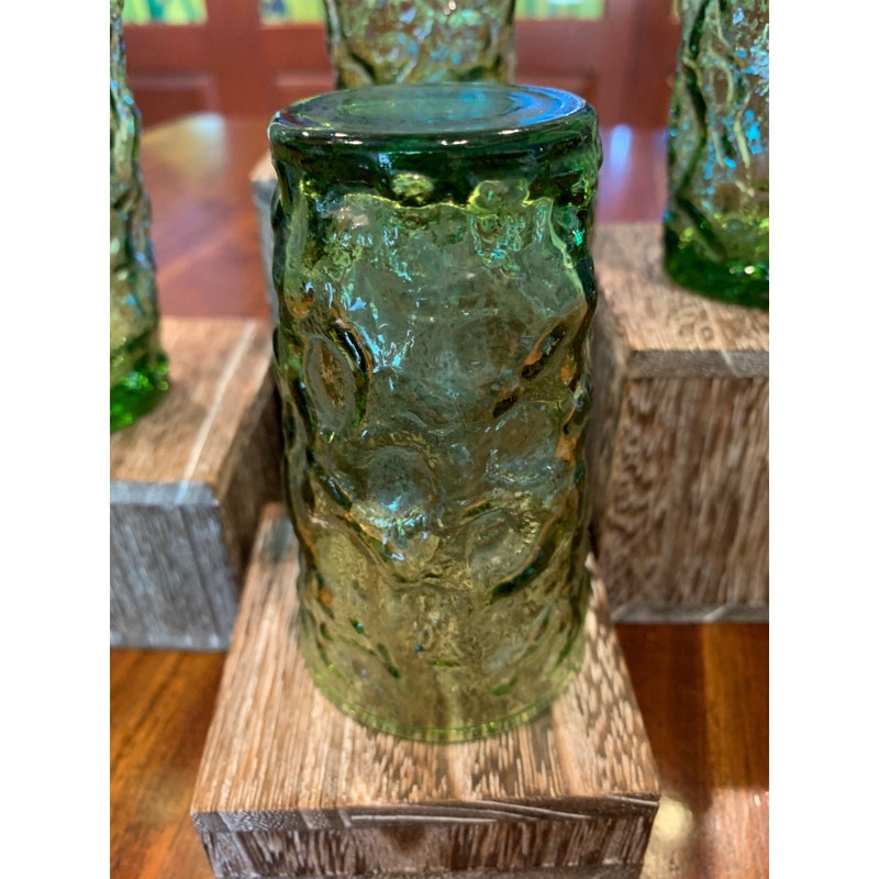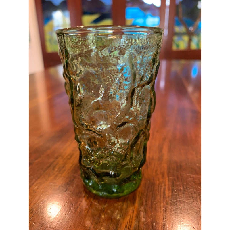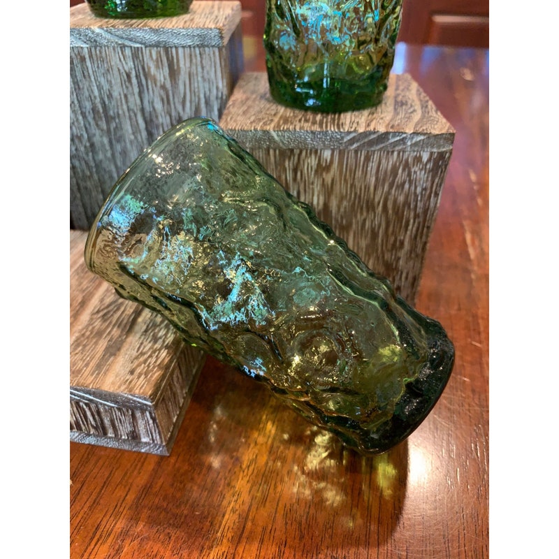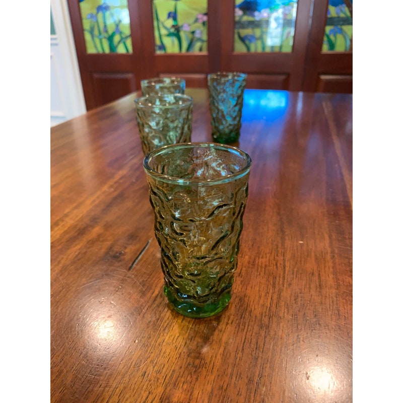 Add a pop of color to your drinkware collection with these vintage Anchor Hocking Lido avocado green juice glasses. The round shape and glossy finish make them perfect for all occasions, while the mid-century modern style adds a touch of nostalgia. These glasses are a four-piece set and stand at 3 3/4 inches tall. Care instructions recommend hand washing only to preserve the pressed glass production style. These glasses are not signed and were manufactured in the United States during the 1970-1979 time period. The Soreno product line ensures quality and durability. Perfect for any beverage, these glasses are a must-have for any vintage lover.