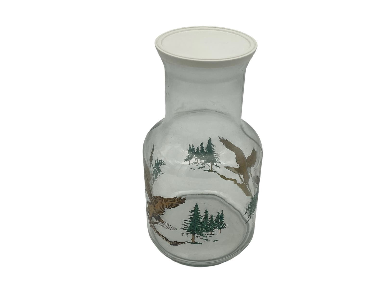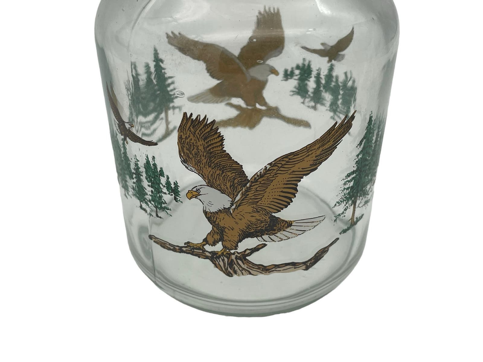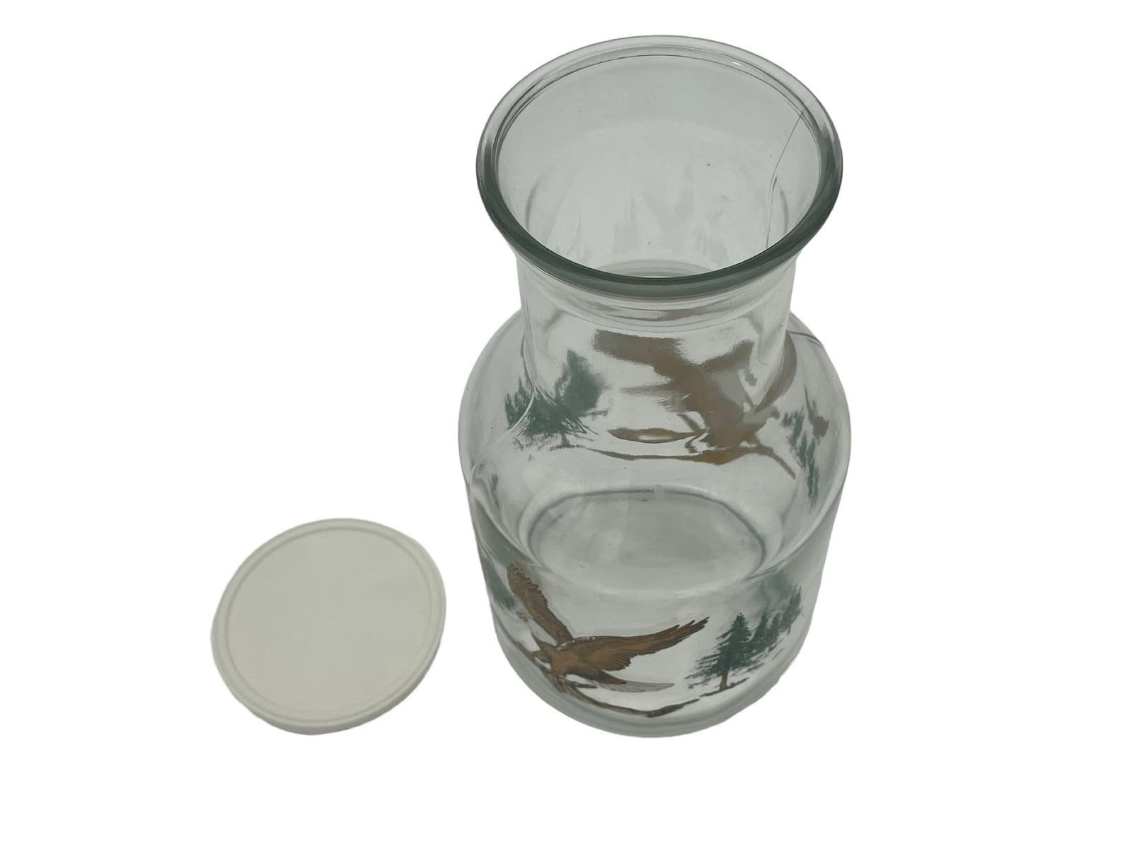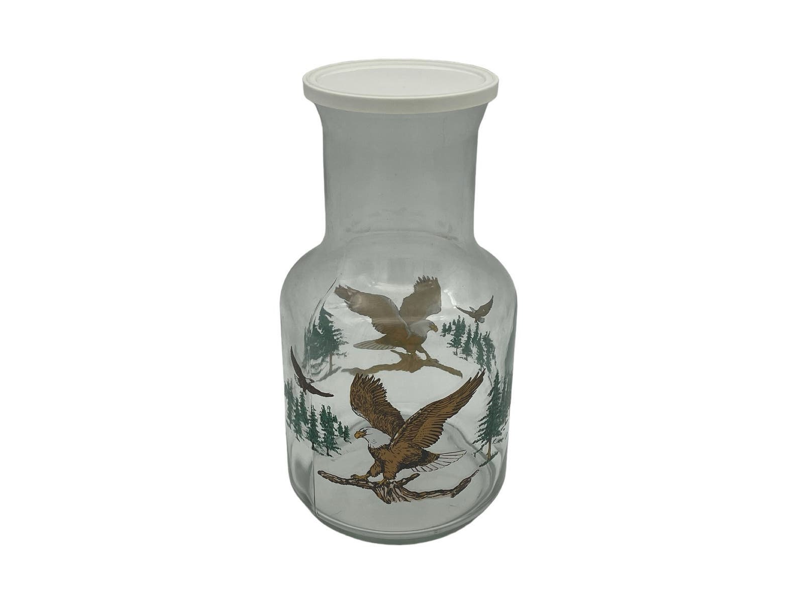 Vintage glass carafe for juice or other beverages. It is clear glass but there is an eagle pattern that wraps around. It comes with the plastic lid for easily storing in the fridge. It would also make a cute vase.