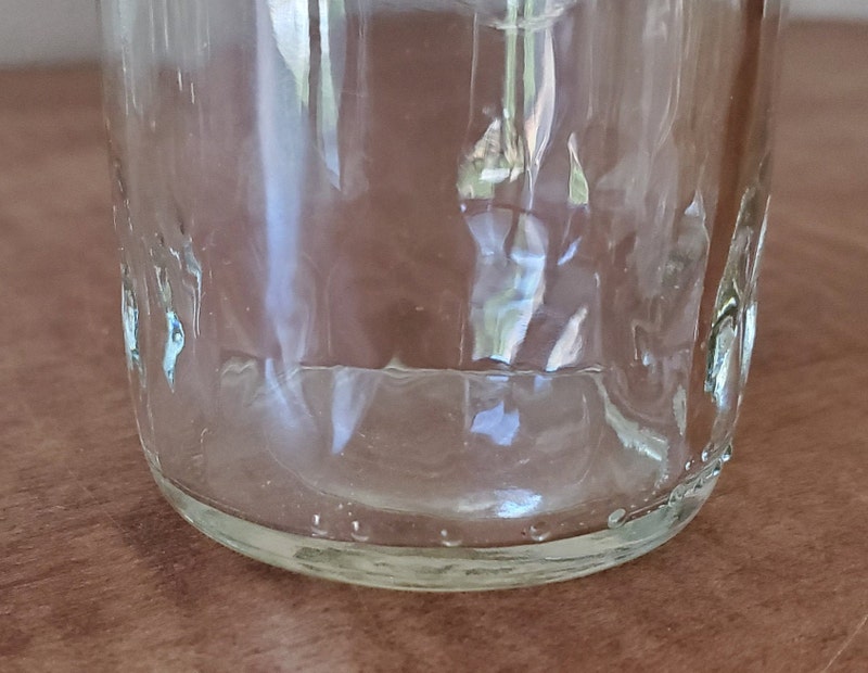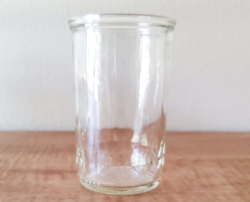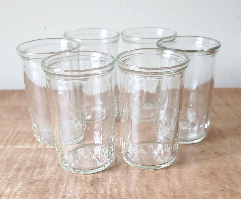 This is 6 Jelly Jars. The jelly jars have a subtle diamond cut pattern on the jar base. The jelly jars are in good condition with scattered fine surface scratches. The diamond pattern jelly jars were common in the 1960's and used by jelly manufactures nationwide. Commonly saved by "housewives" to serve juice to their families. The glasses are in varying shades of clear glass.