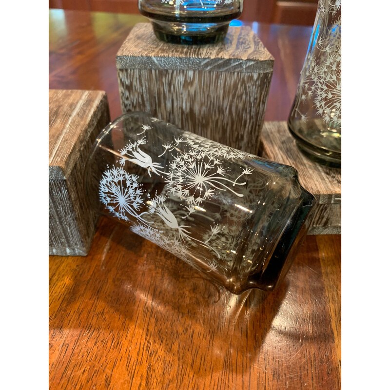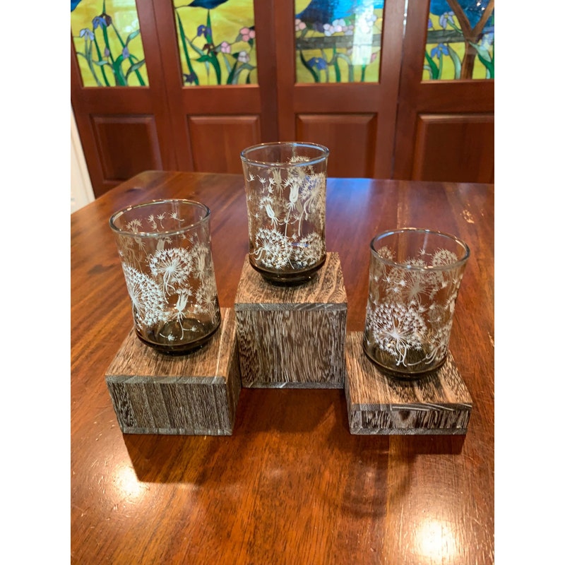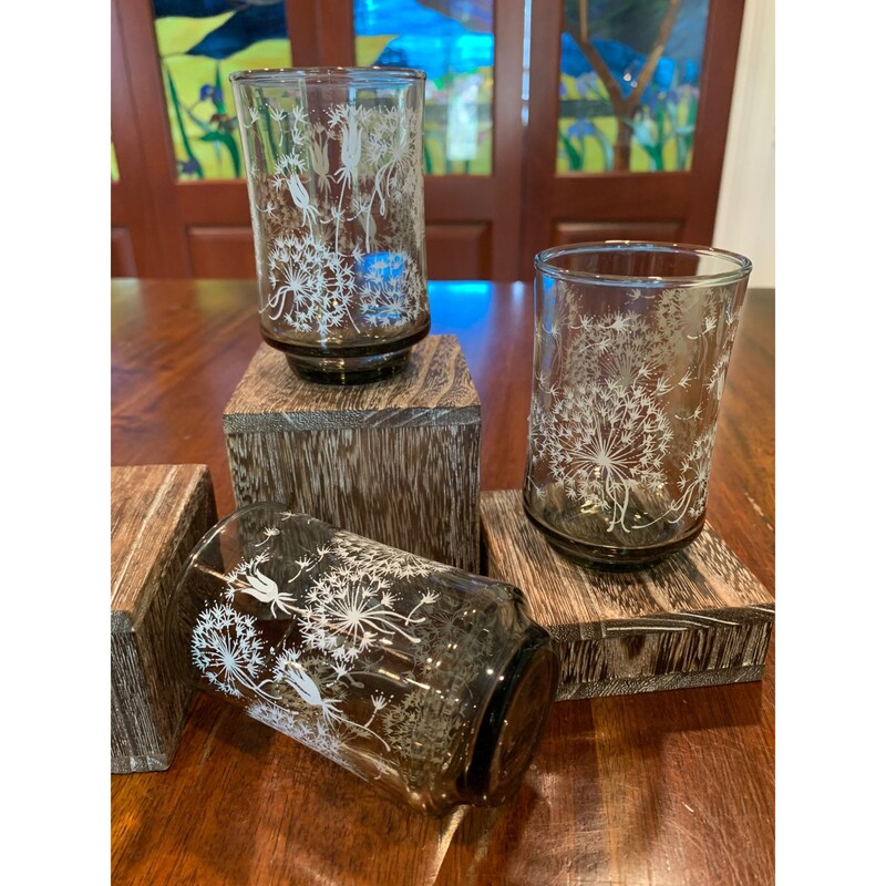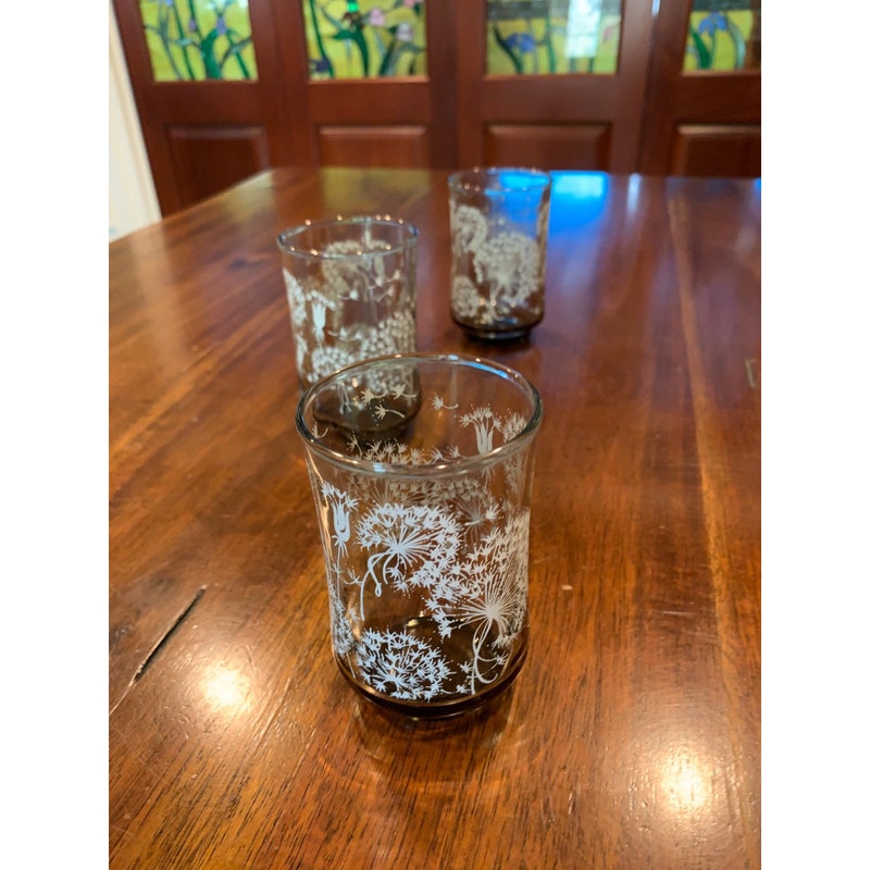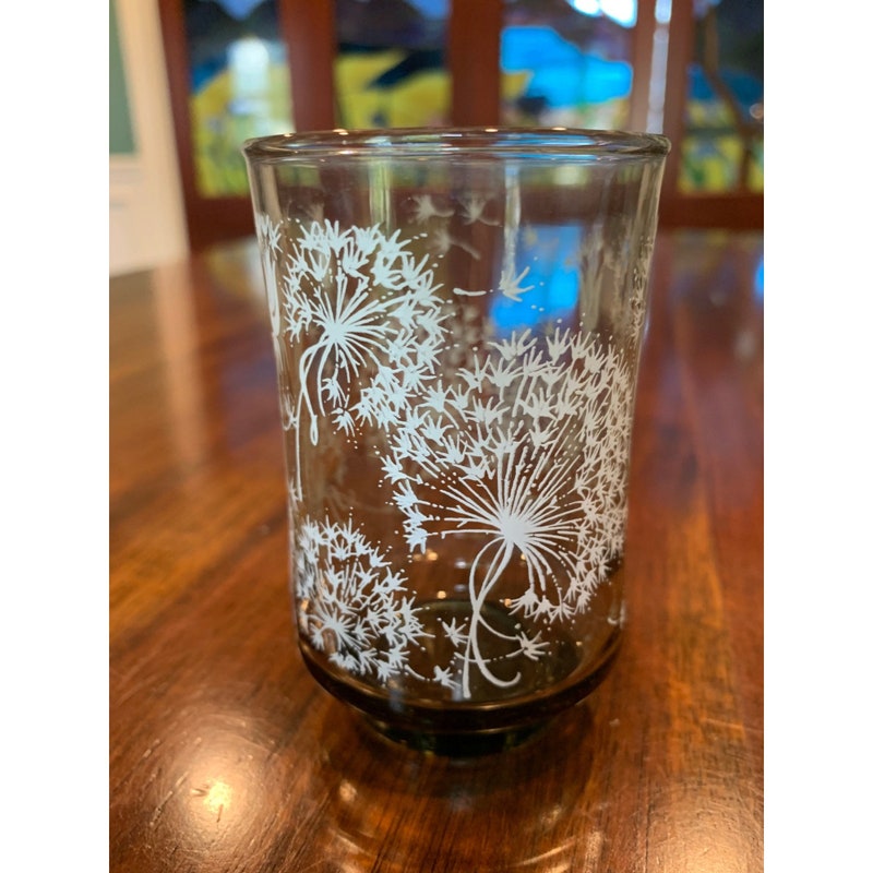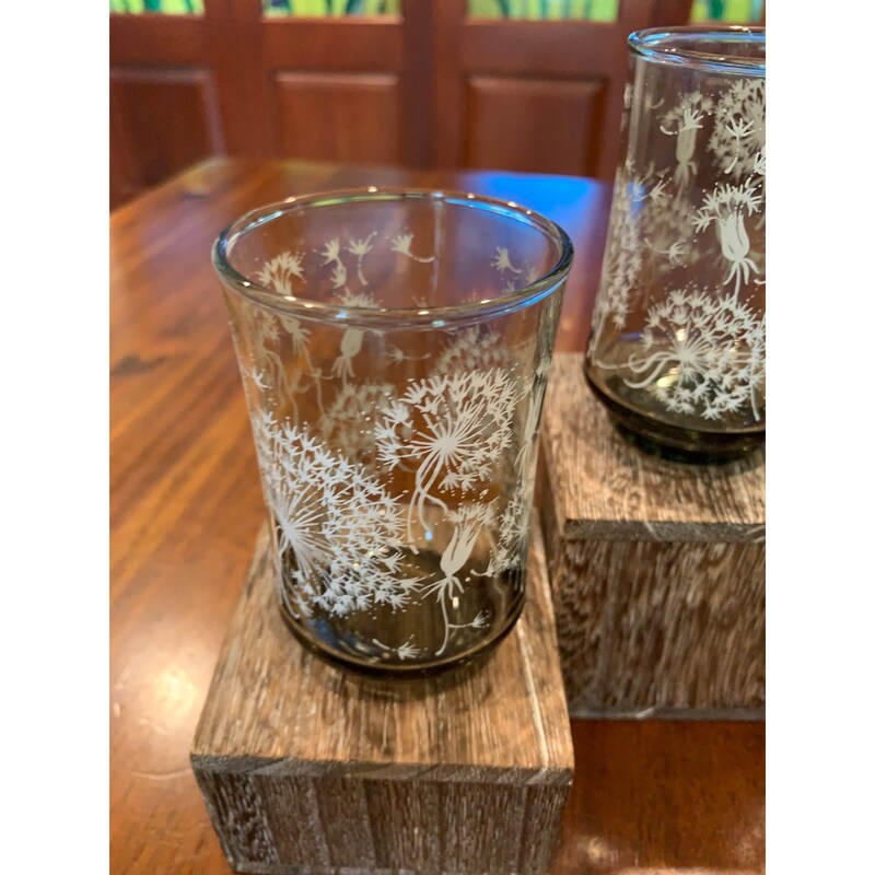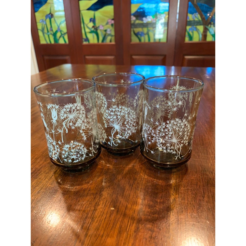 Add a touch of vintage charm to your drinkware collection with these beautiful Libbey juice glasses. The set includes three round glasses in a lovely dandelion pattern, perfect for all occasions. The glasses are made of high-quality glass and have a glossy finish. These mid-century modern style glasses are from the United States and were produced in the 1970s. They are part of the Wildflower product line and are elegant additions to any collection. Hand wash only and measure 3 5/8" in height. The glasses are not signed, but their beauty speaks for itself.