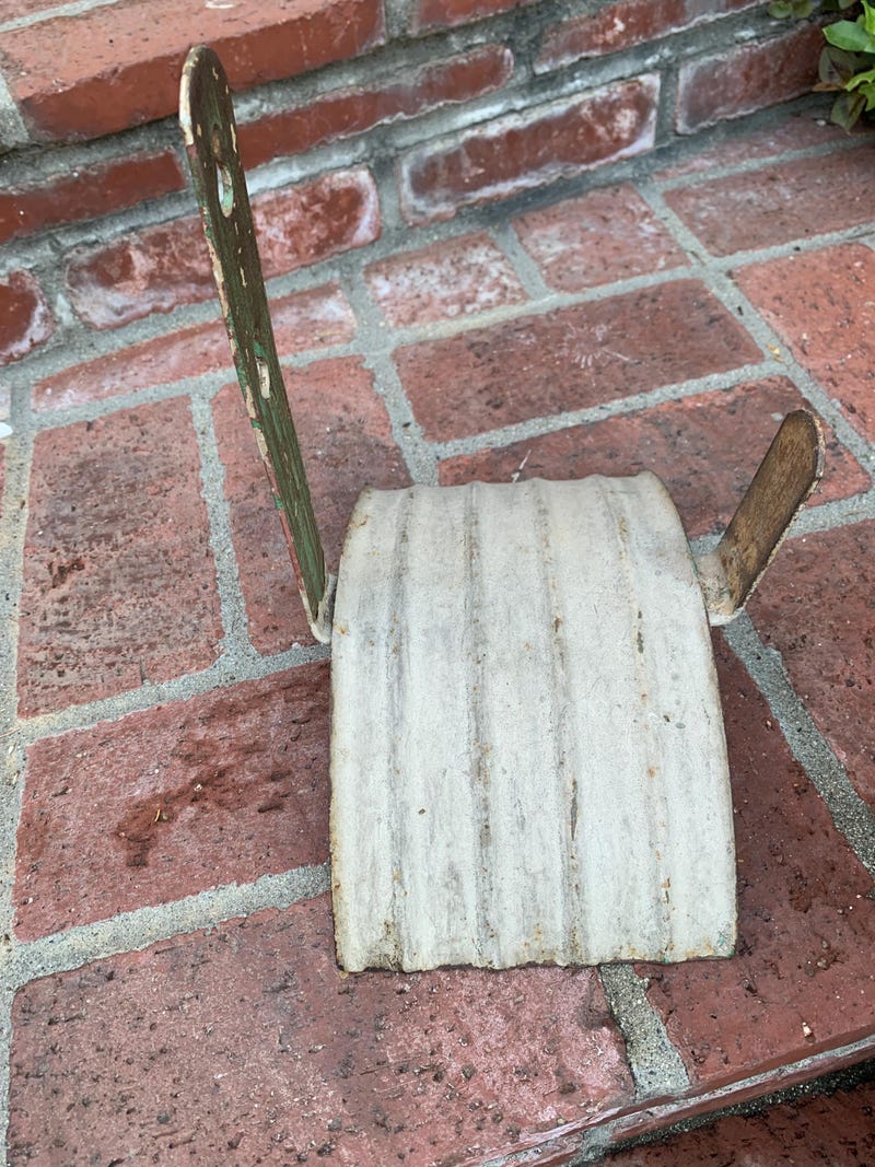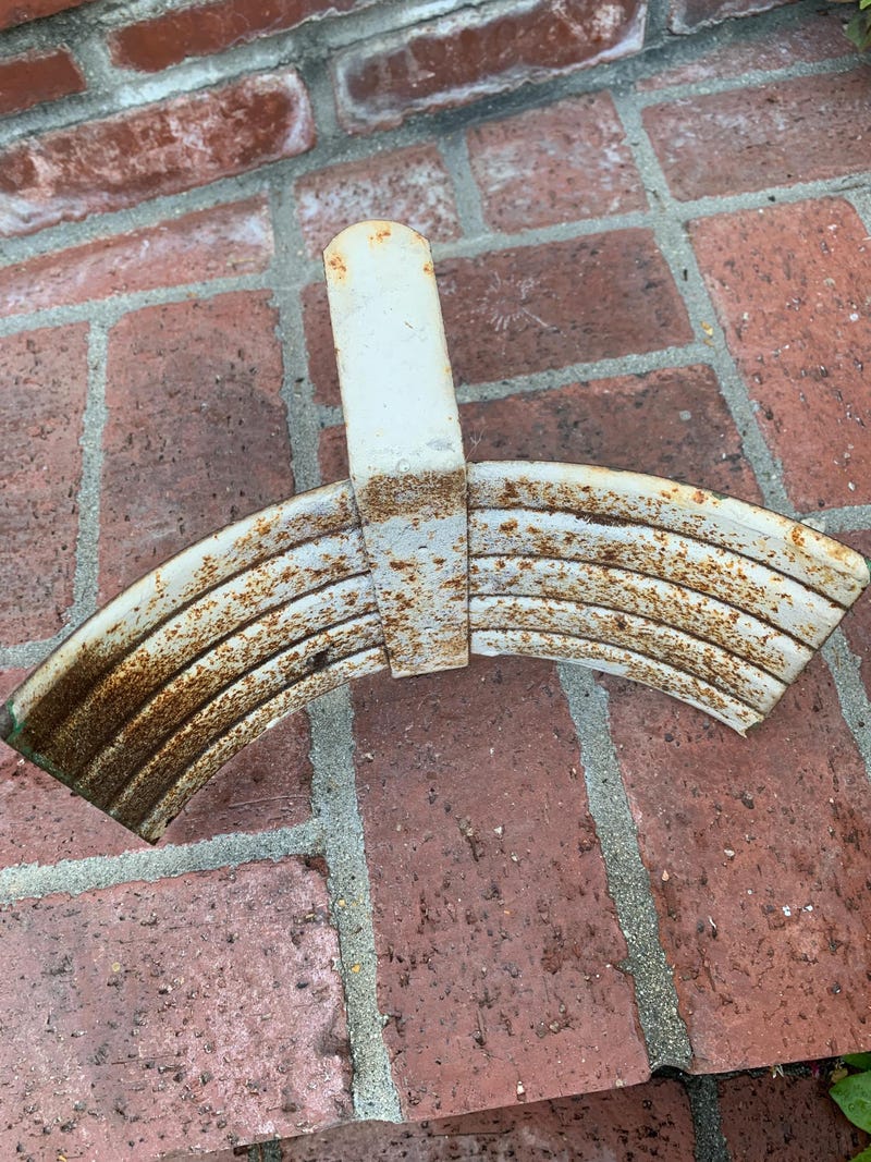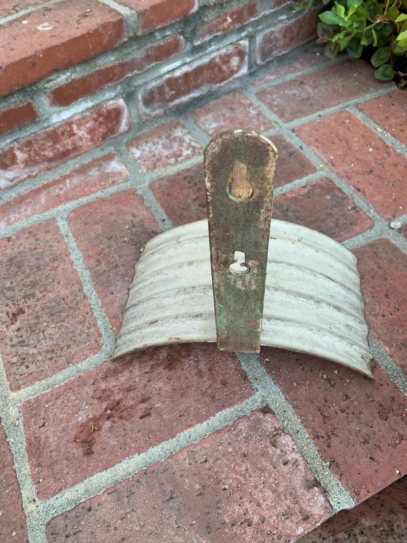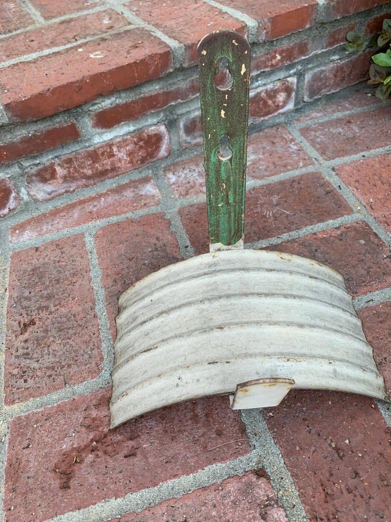 Sweet old hose holder that mounts to the wall or garden fence. It measures about 10 inches across and stands about 10.25 inches tall. Two hanging drilled holes in the mounting back strip. Chippy paint and rust underneath but still very usable and solid.