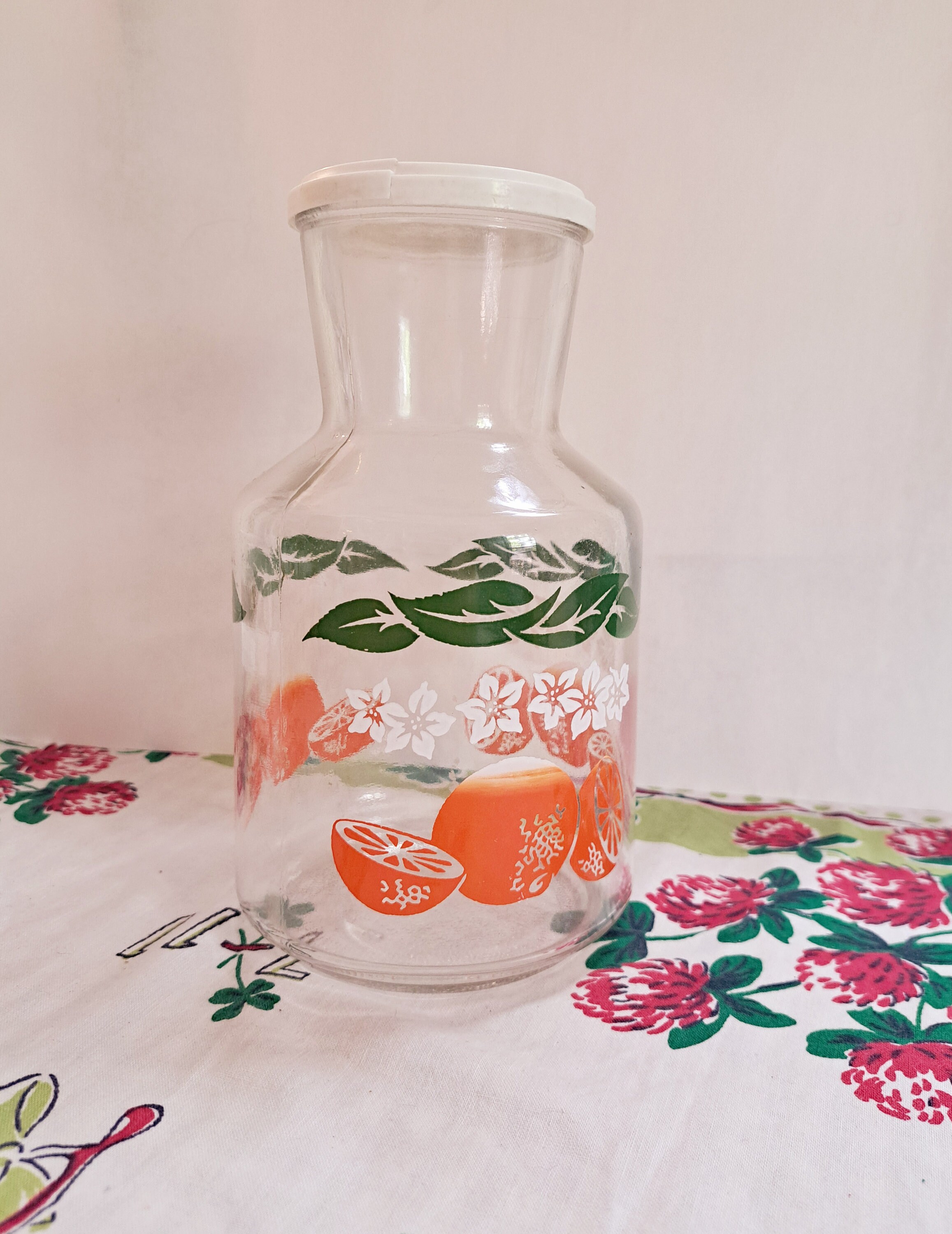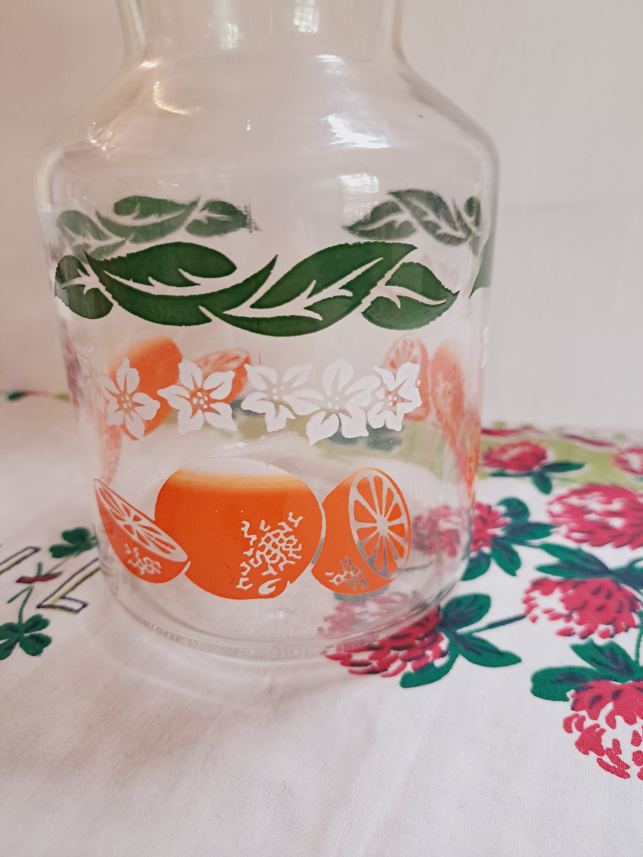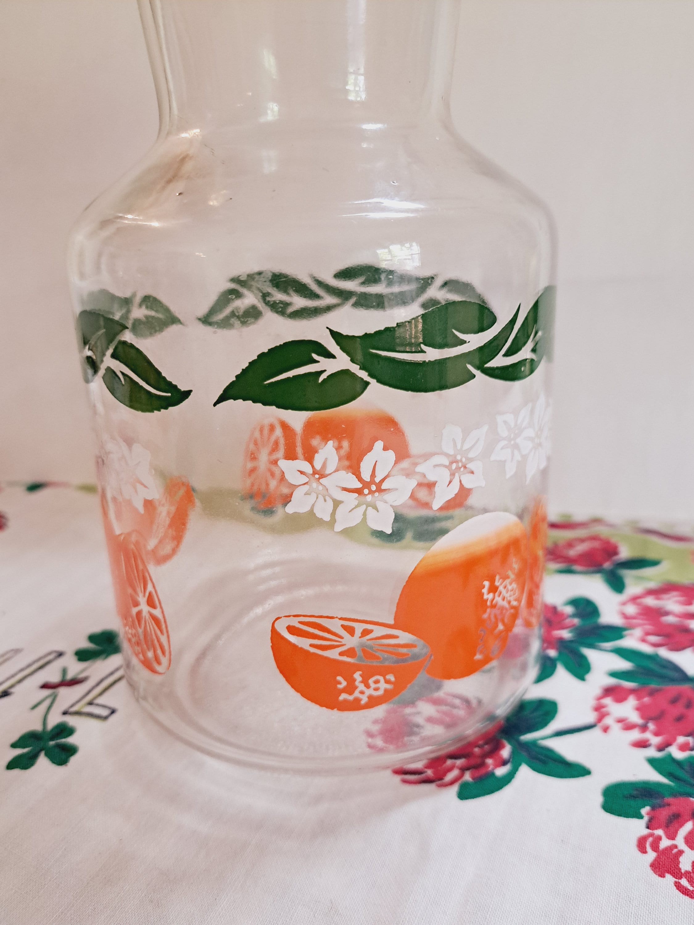 Vintage Glass Carafe with delightful pattern of oranges, green leaves and white flowers, just the thing to brighten up your morning.