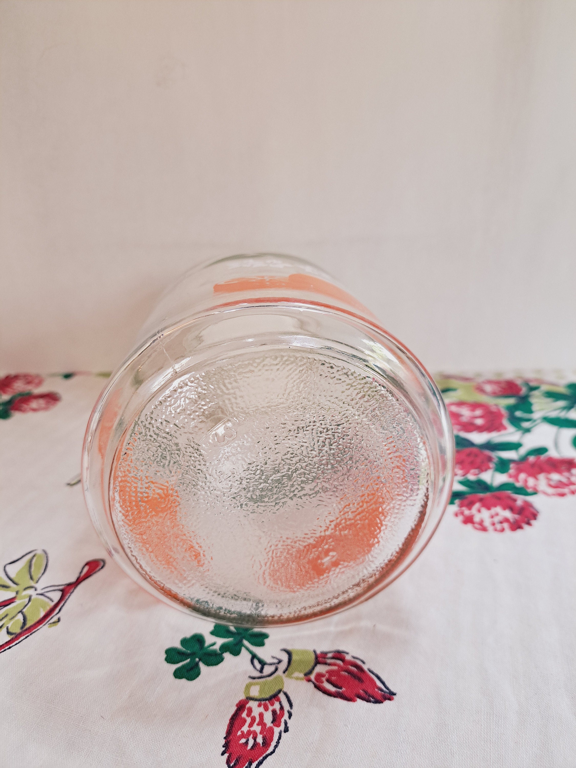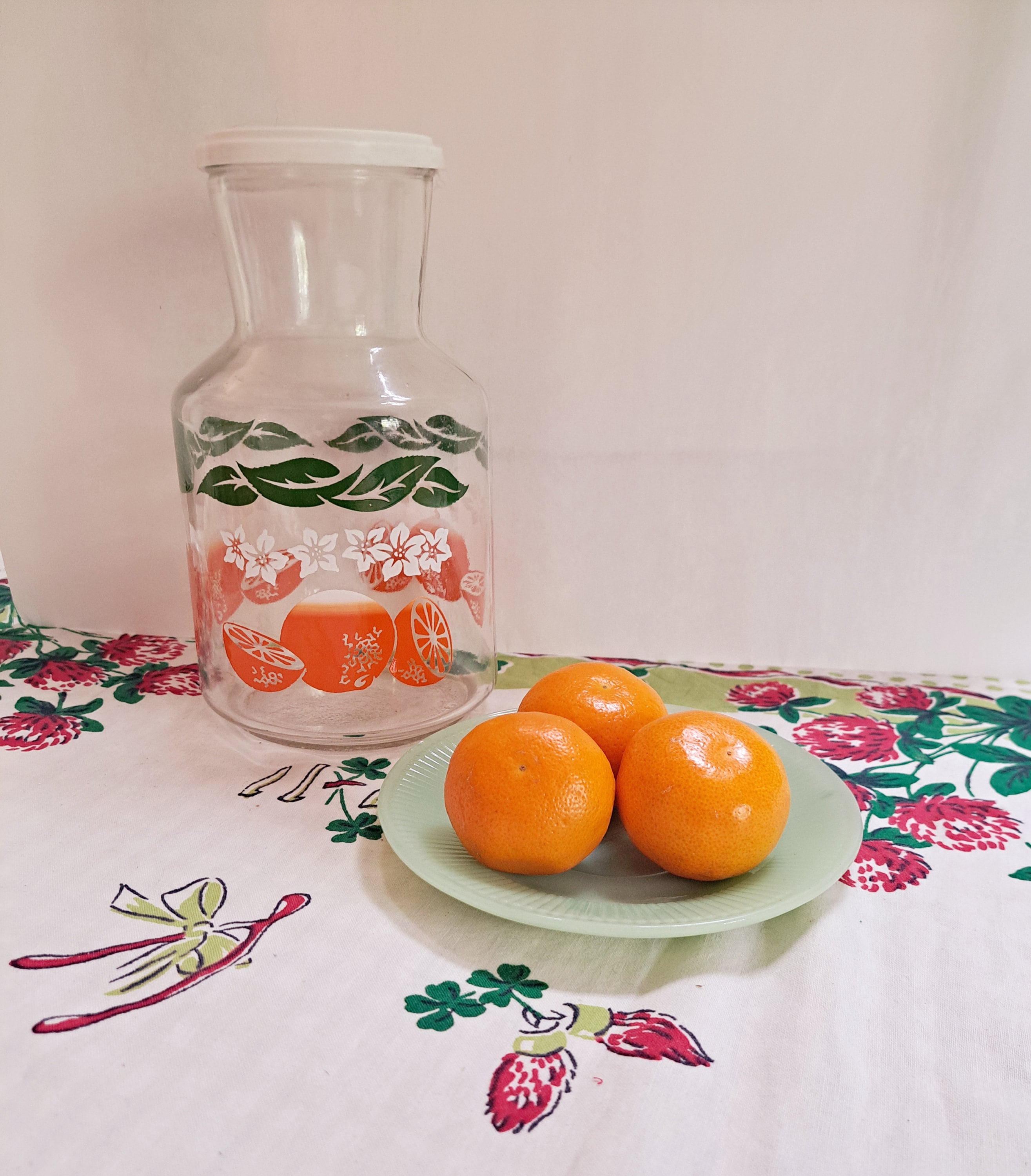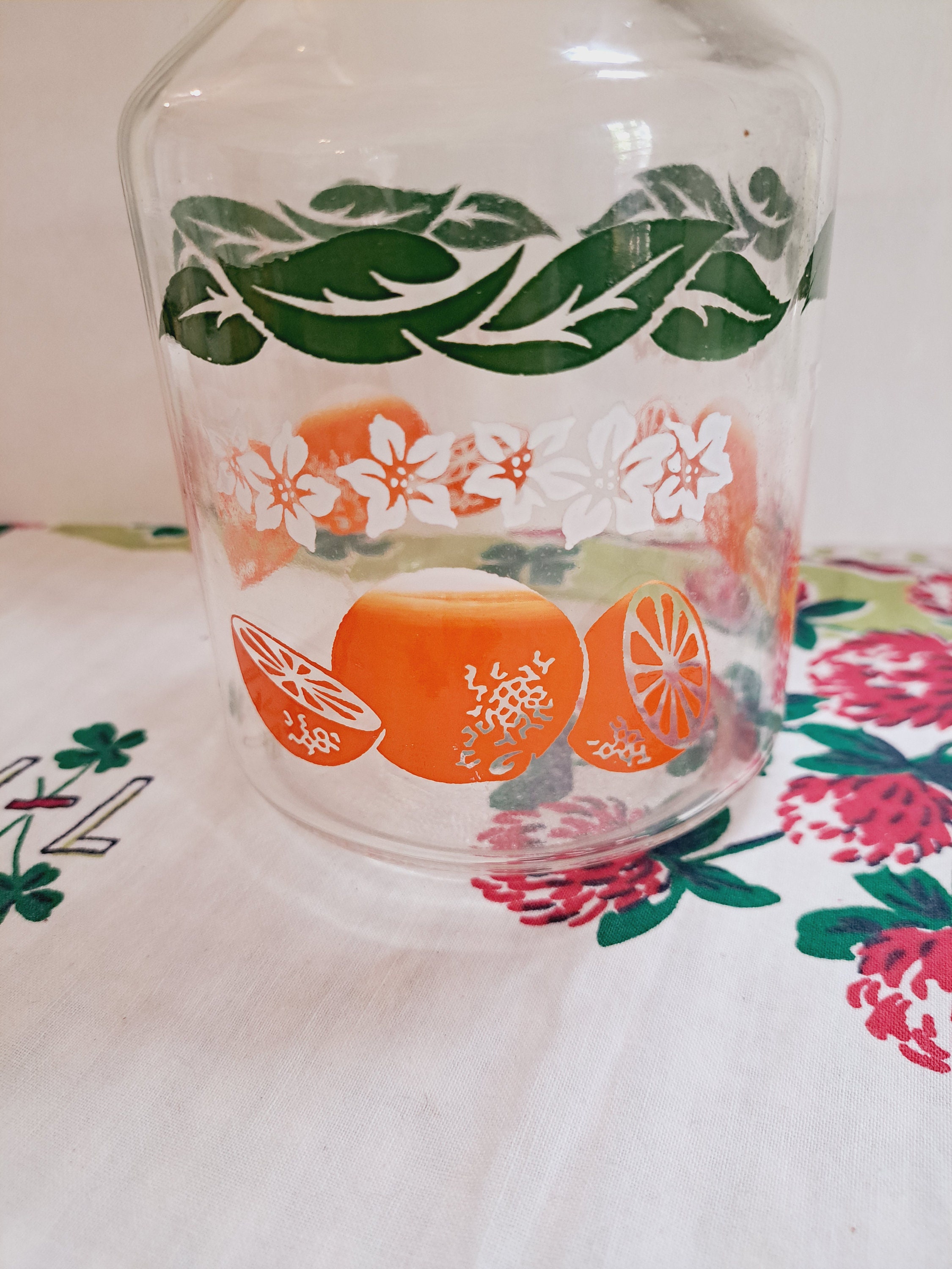 Vintage Glass Carafe with delightful pattern of oranges, green leaves and white flowers, just the thing to brighten up your morning.