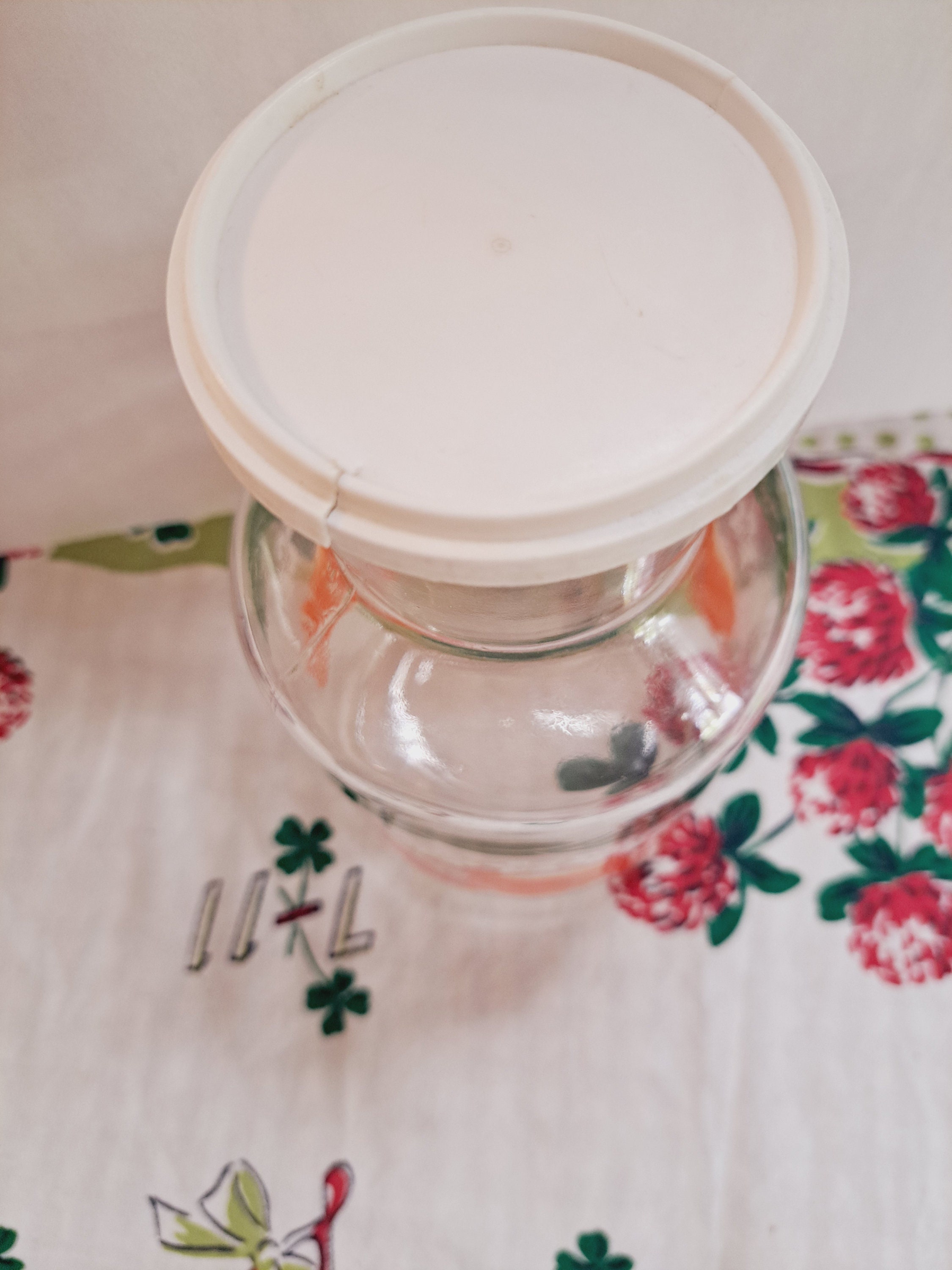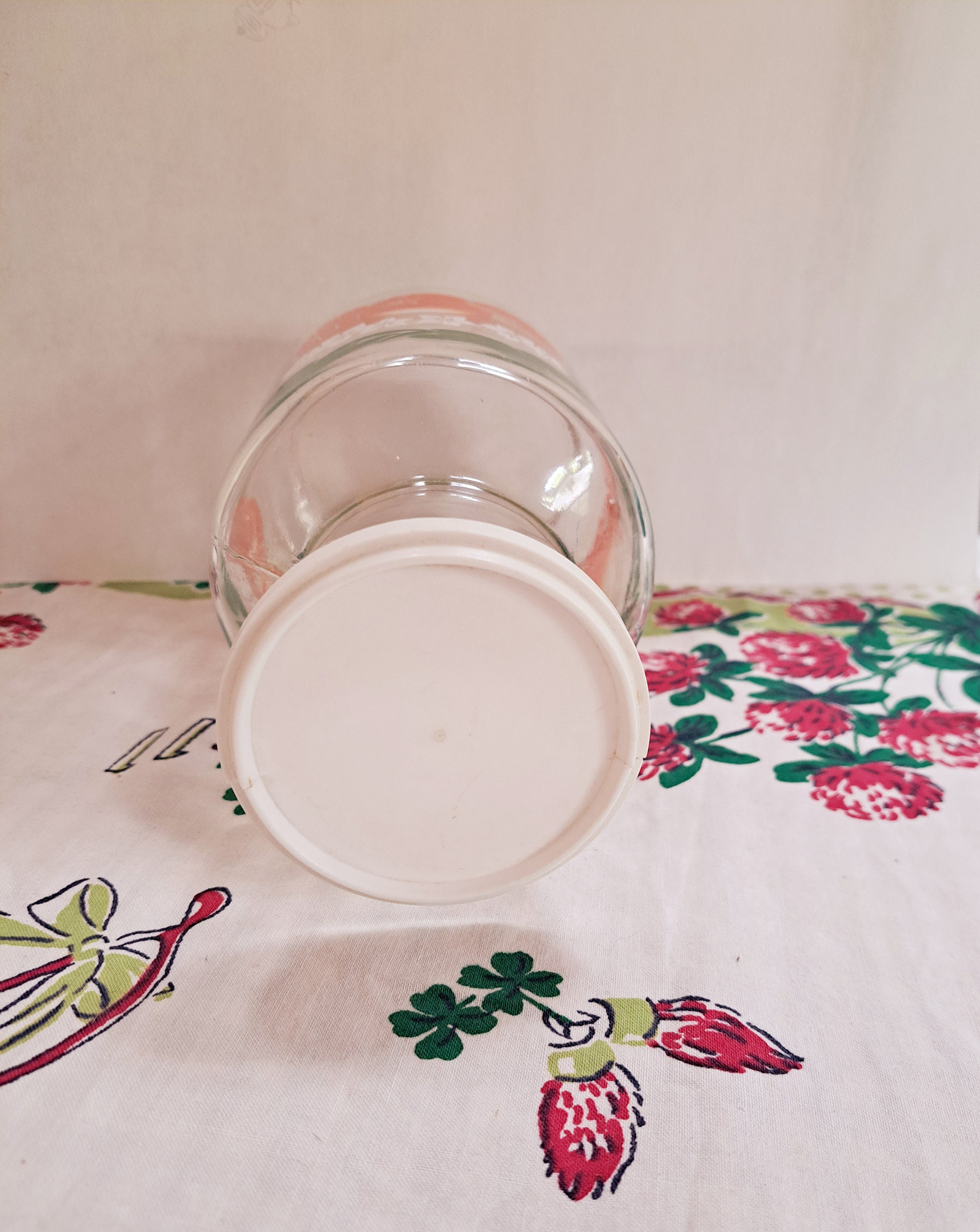 Juice decanter, or a flower vase, bookshelf or kitchen decor. Measures 8" tall, 4 1/4" across the base, 3" opening. 2 splits, one on each side of the white plastic lid. The carafe has no chips, no cracks, great color. Just a tiny bit of paint loss on the outer edge of 2 oranges. The numbers 3 & 1 are on the bottom of the jar, the lid is marked E-S Inc Angola IND.