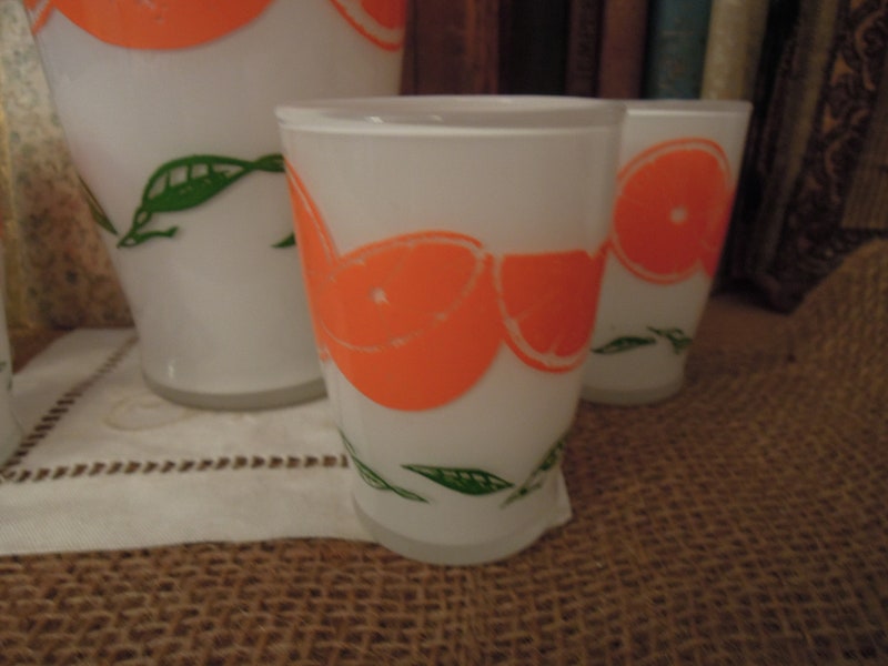 Vintage Orange Juice Pitcher and Matching Glasses / White Glass with Oranges Green Leaves / Mid Century Kitchen-sid-19754