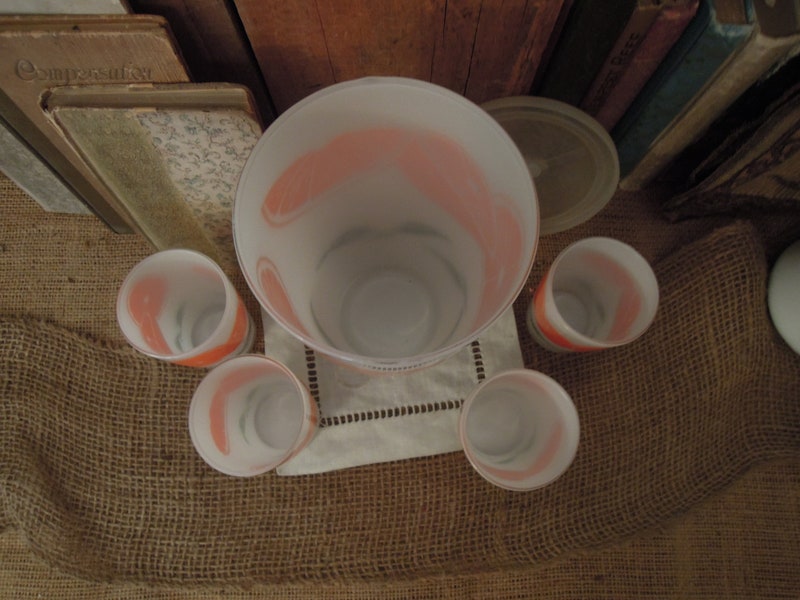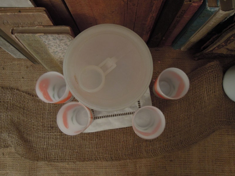 Very pretty glass carafe and 4 matching juice glasses. White glass with oranges and green leaves. It also has its original plastic lid. Great piece for your mid century kitchen. in great vintage condition.