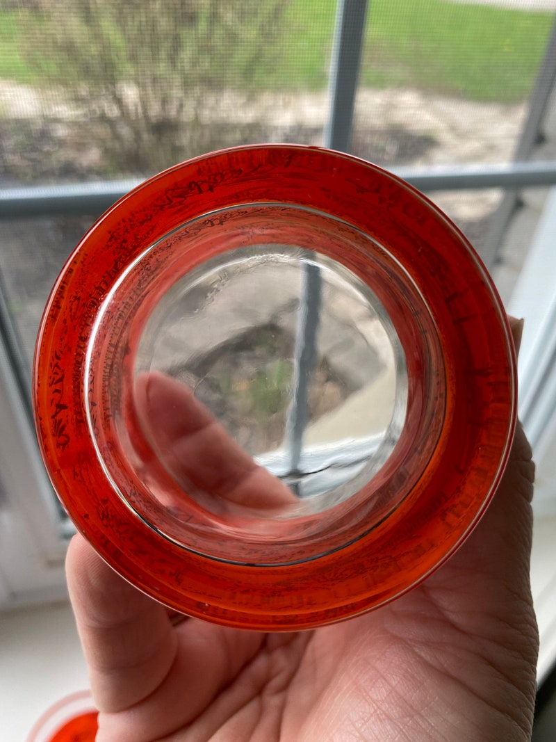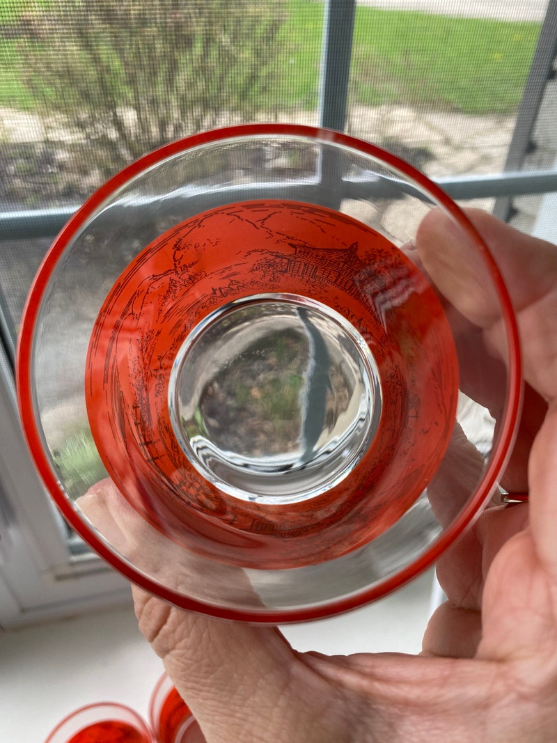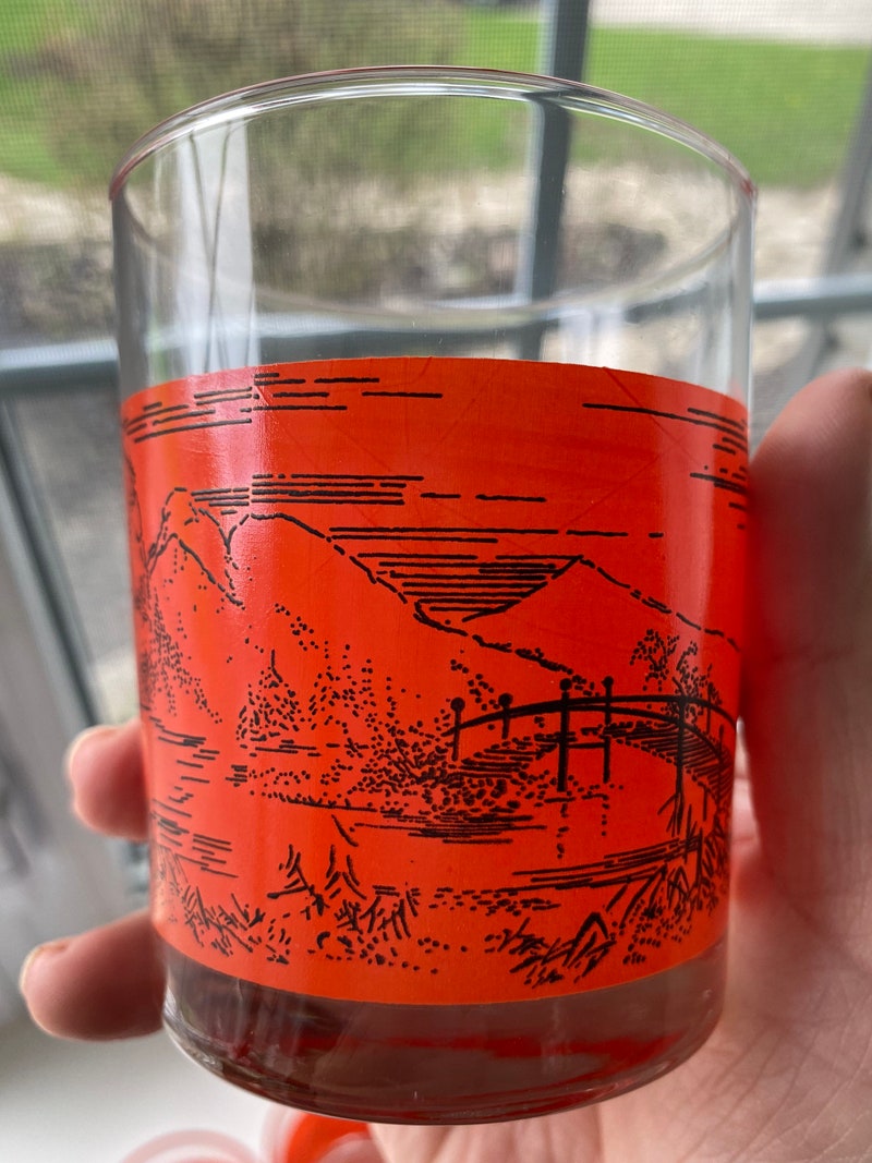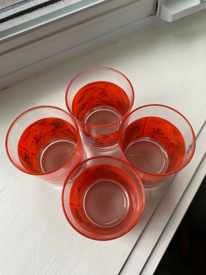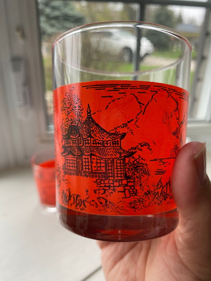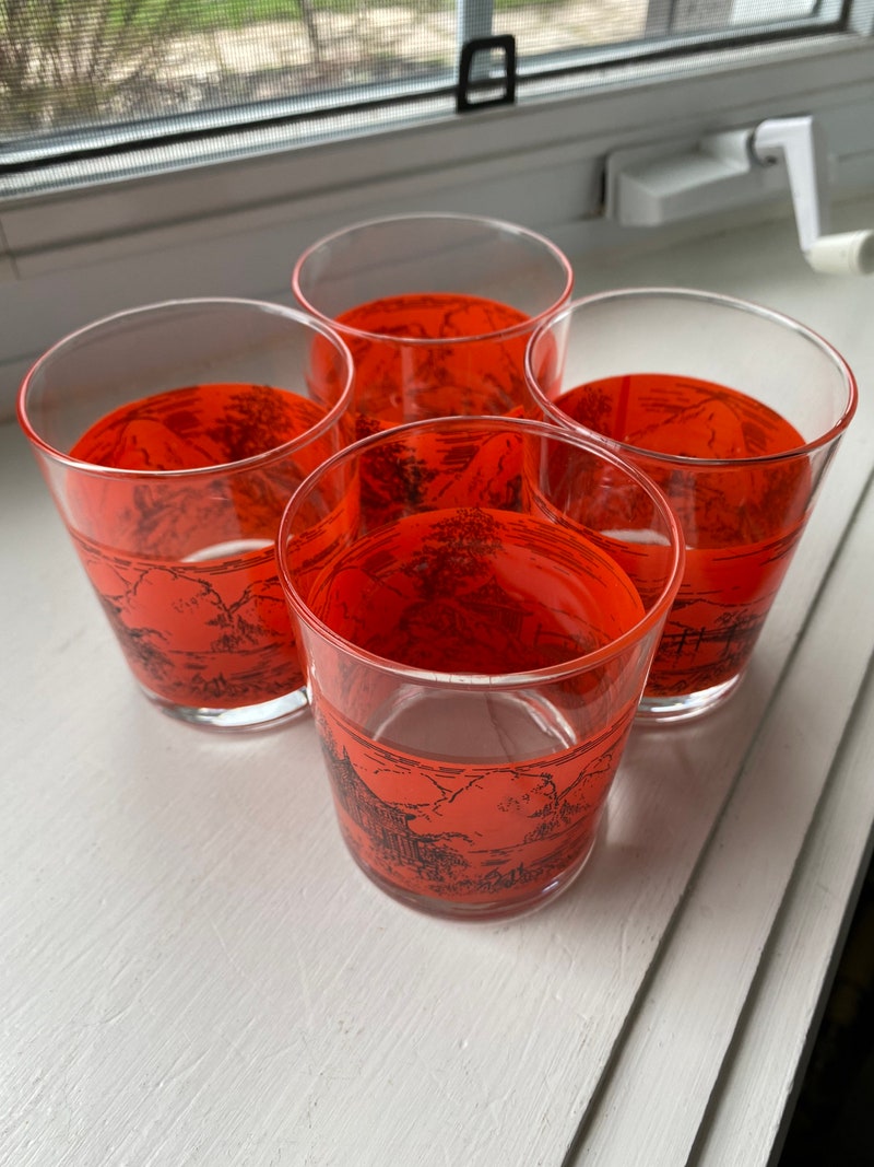Vintage Set of 4 Bar Glasses In Bright Orange/Red With Pagoda and Mountains Scene, Retro Barware, Scotch Glasses-sid-46136
