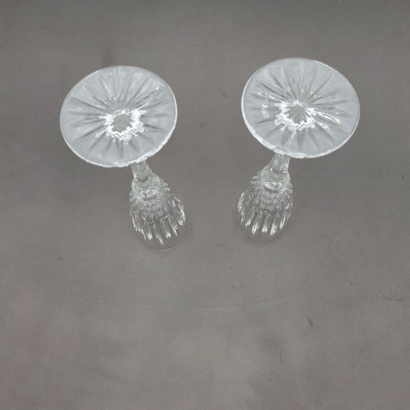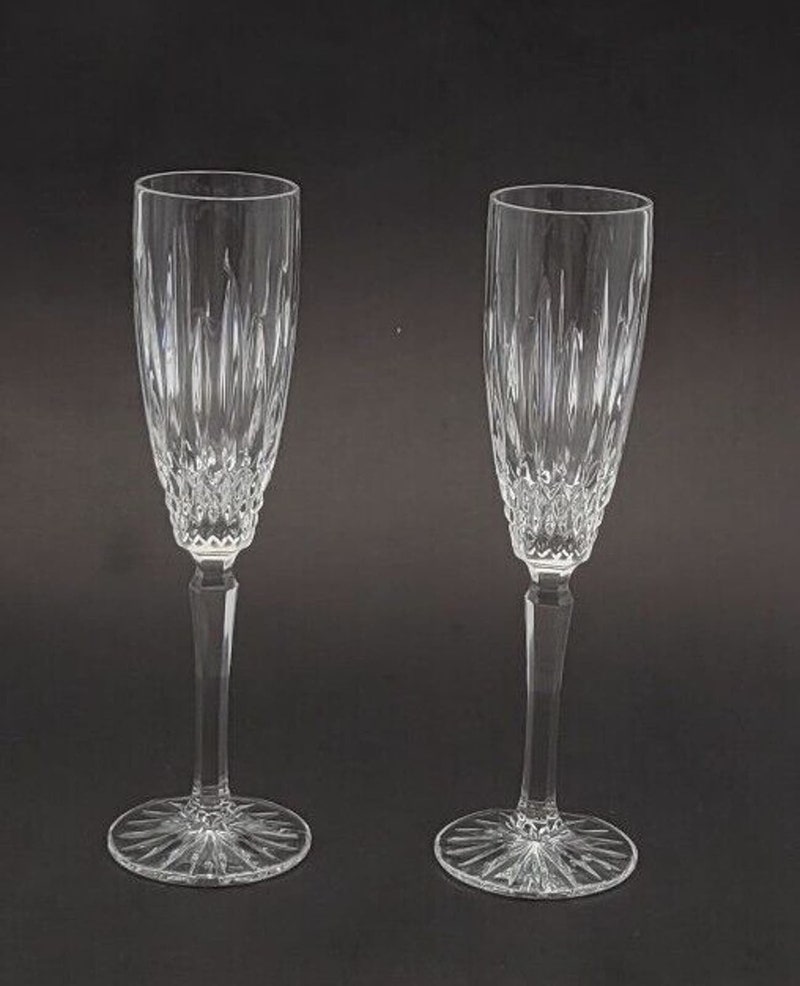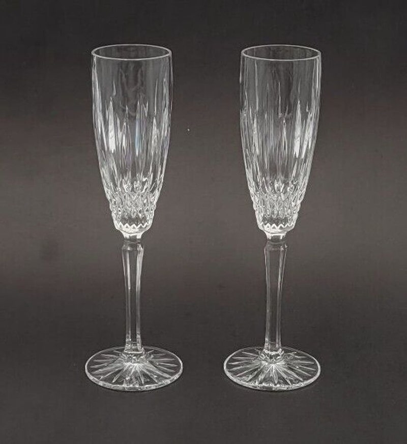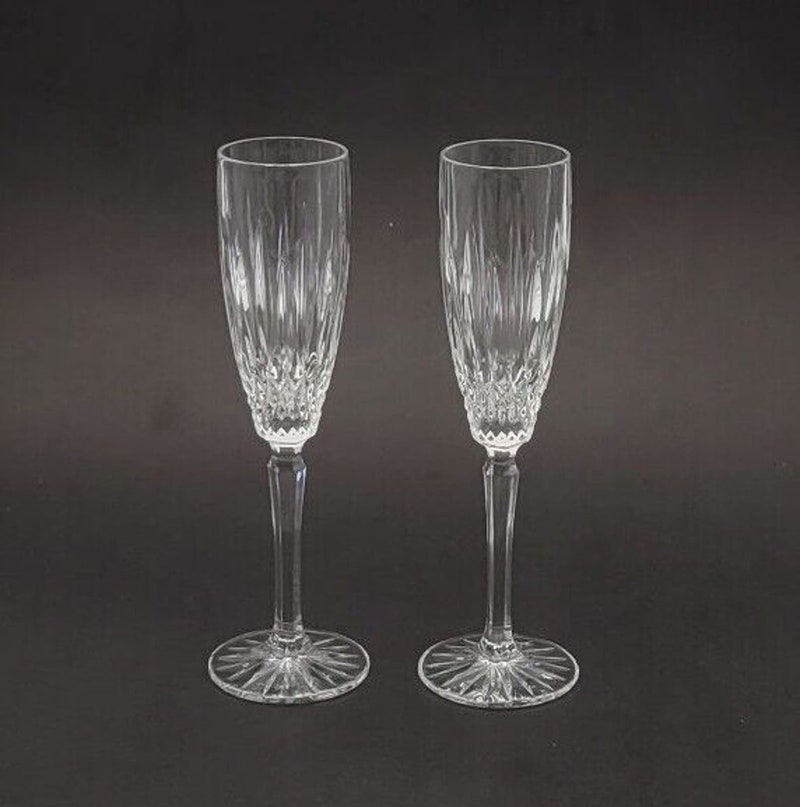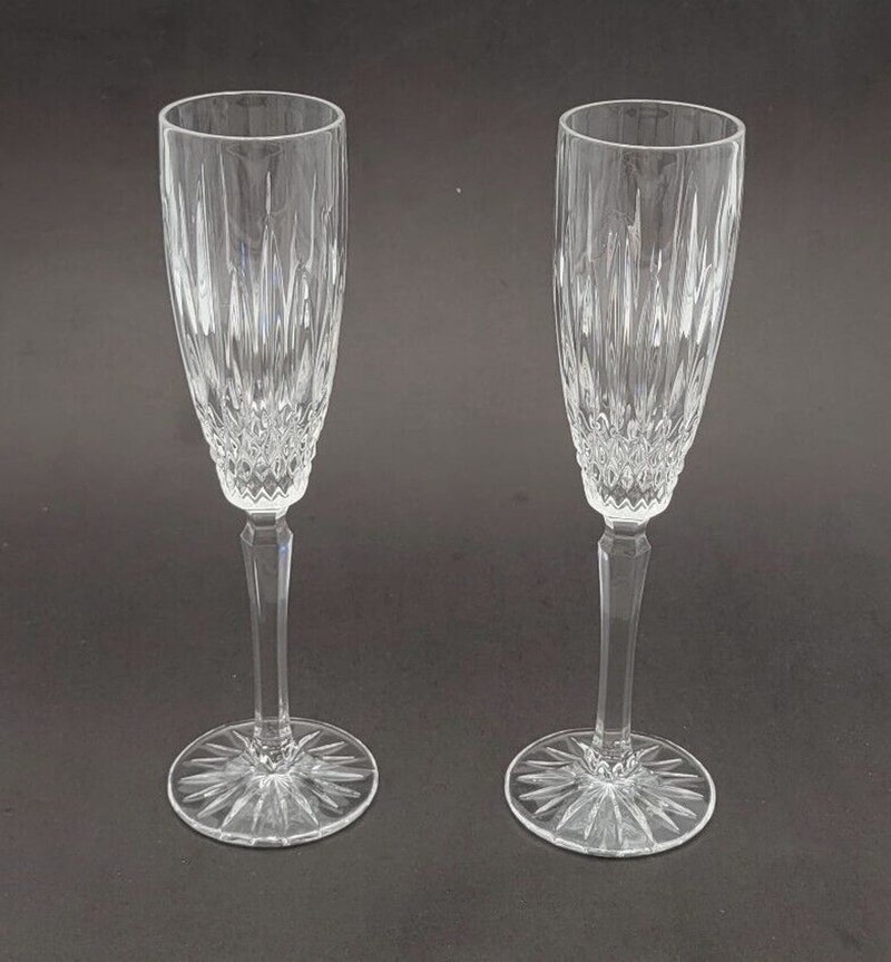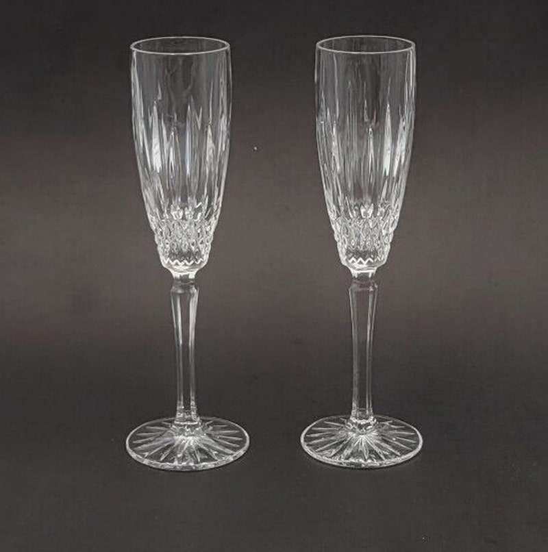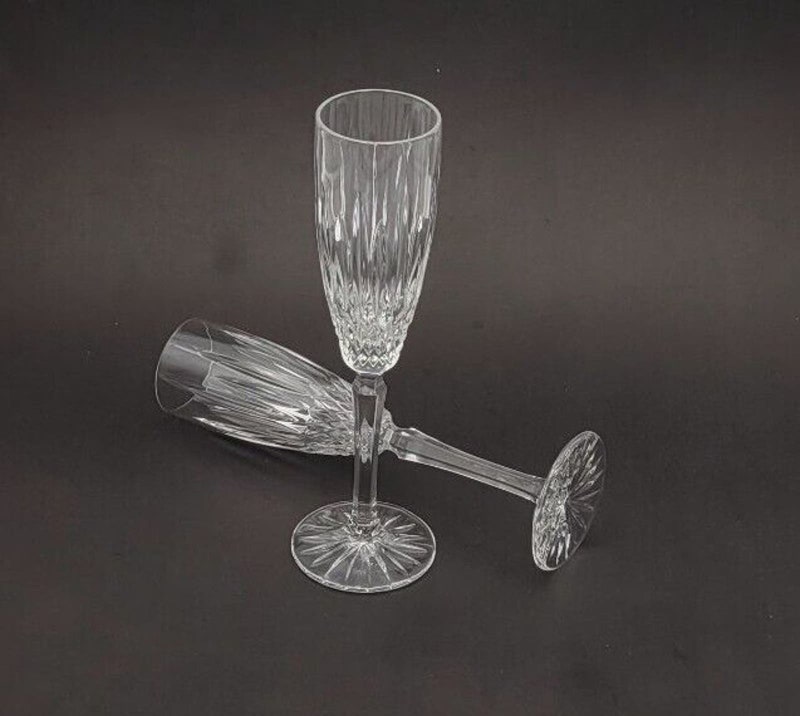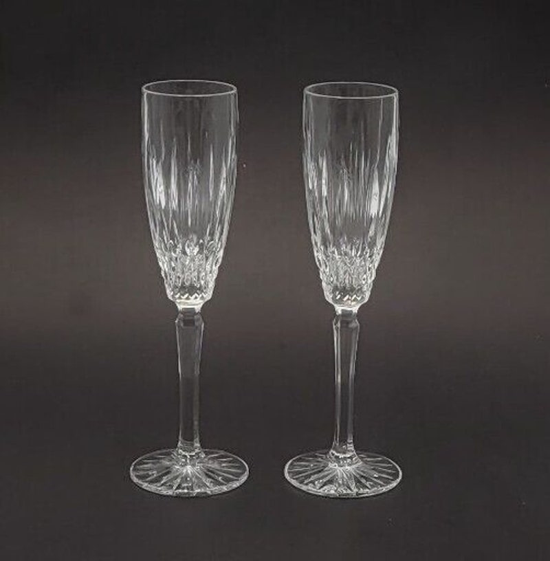 This set of two Mikasa Old Dublin champagne glasses is a must-have for any Crystal collector. The fluted design adds elegance to any occasion, and the clear color allows the champagne to shine through beautifully. These glasses were made with high-quality crystal material and are no longer in production, making them a rare find.